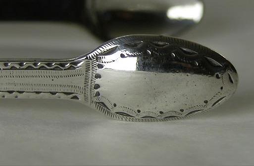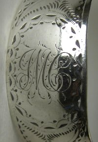 These are a pair of standard style bright cut tongs. They are unusual in that they have the family monogram engraved vertically on the bow instead of the more normal horizontal way.