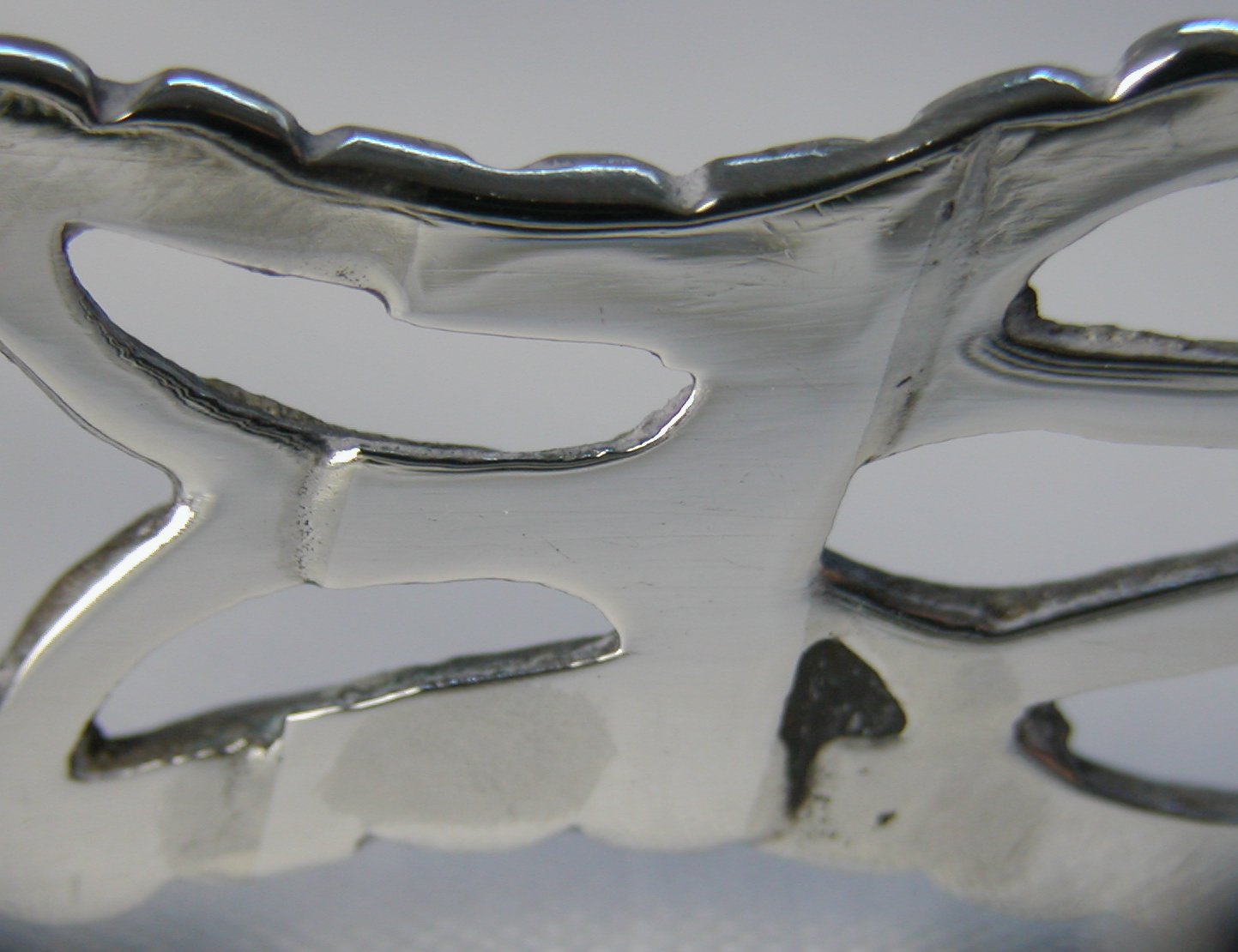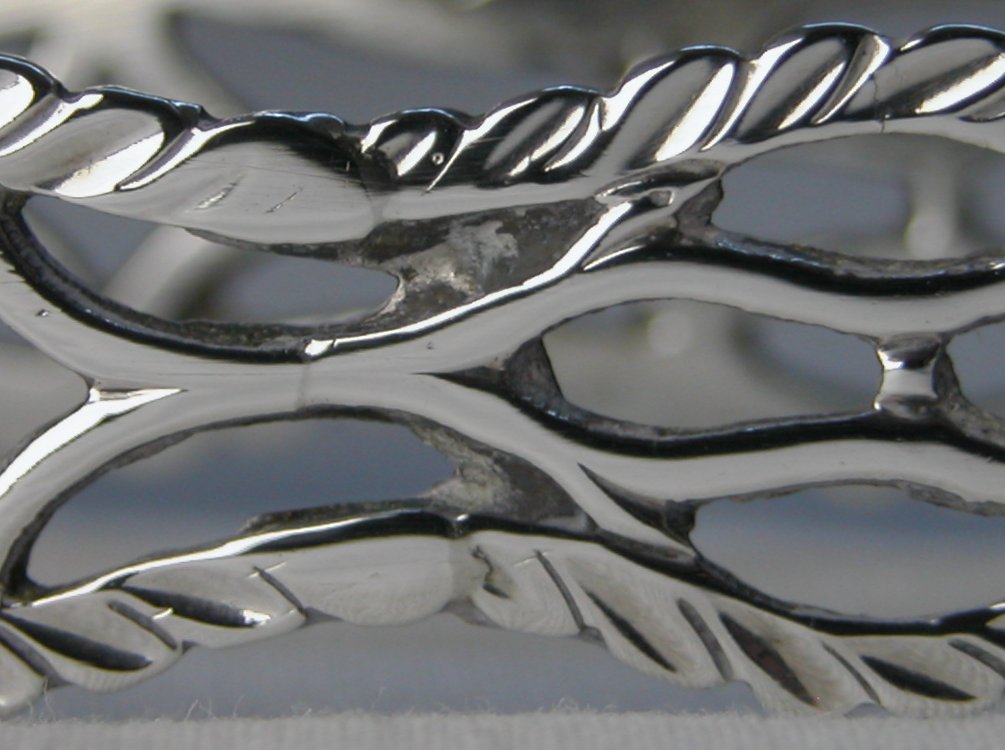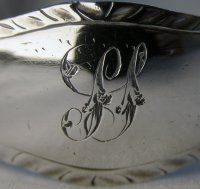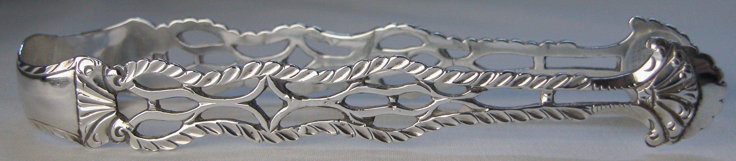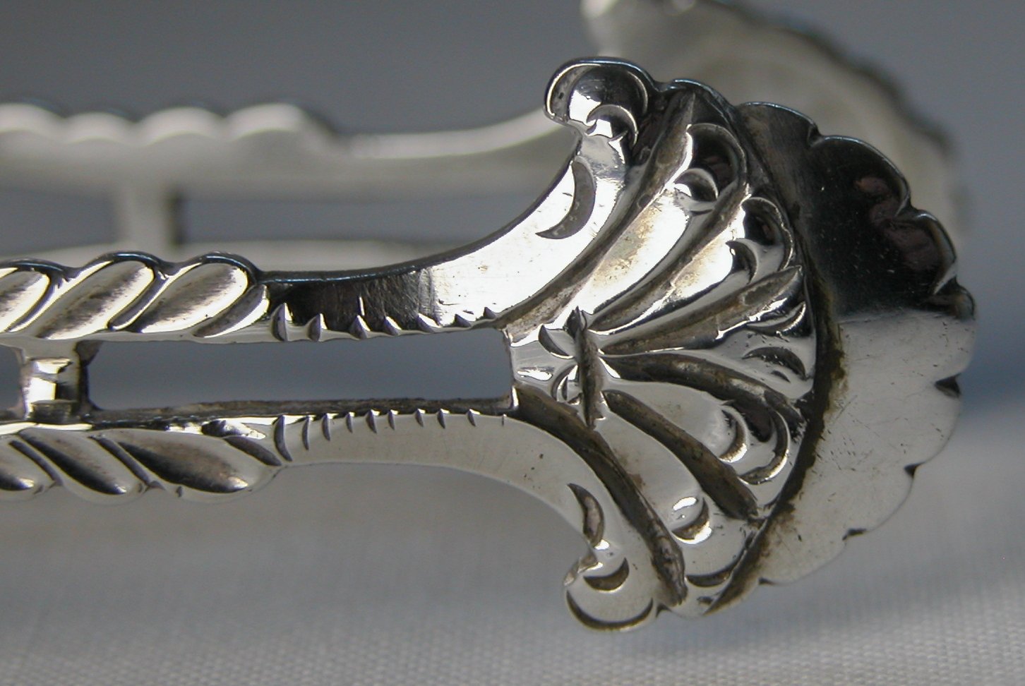 These tongs are interesting, in that they are only 5 inches long - shorter than most. They are also have the "half" cast shell bowls. As usual, these tongs also have a repair. This time a plate has been soldered onto the back of one of the arms. This repair is one of the better ones I have seen as the silversmith has been quite careful to try to disguise it from the front, not completely successfully - but nearly. Click on any picture to enlarge |