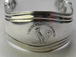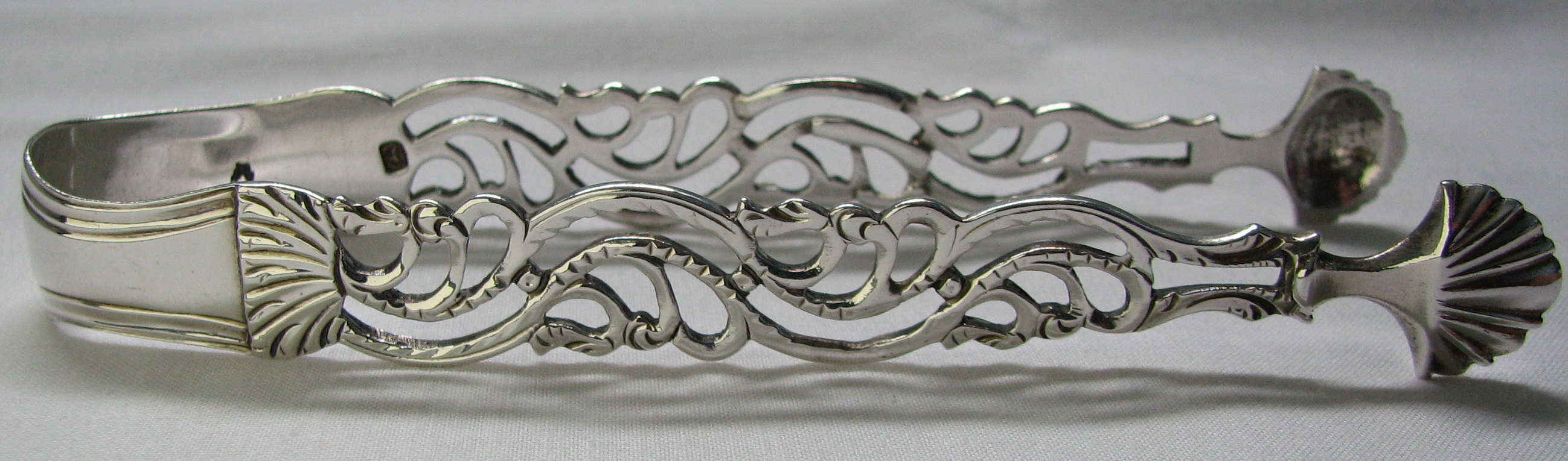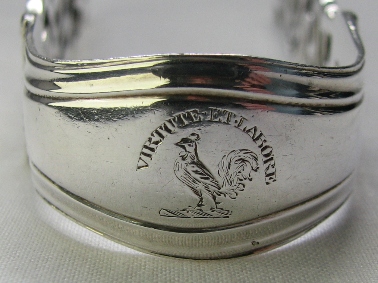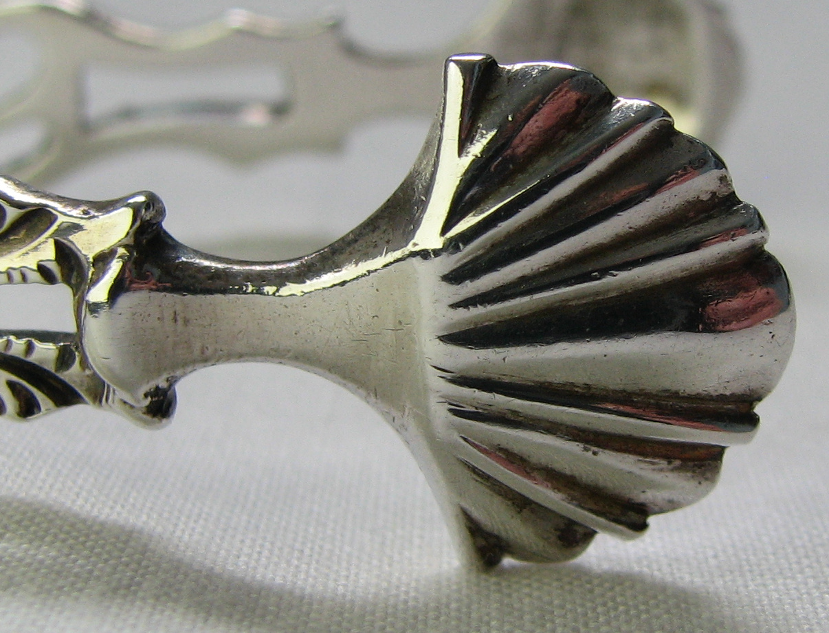 These are a pair of open-work cast tongs with a shell bowl. As is so often the case with this style of tongs, they have been repaired. What makes these interesting is the crest. It has the motto "Virtute Et Labore". The Scottish Cochrane clan had this motto but their crest was with a horse. I have not been able to find any examples of the crest with a Rooster. Click on any picture to enlarge |
