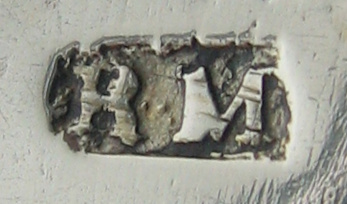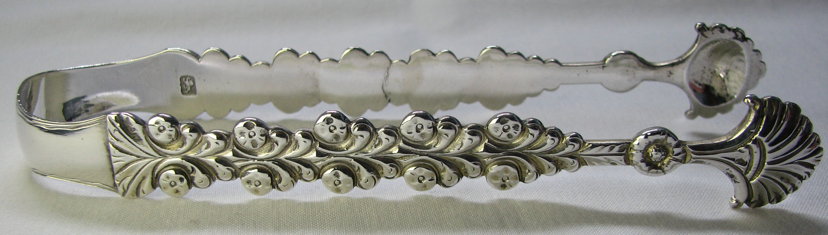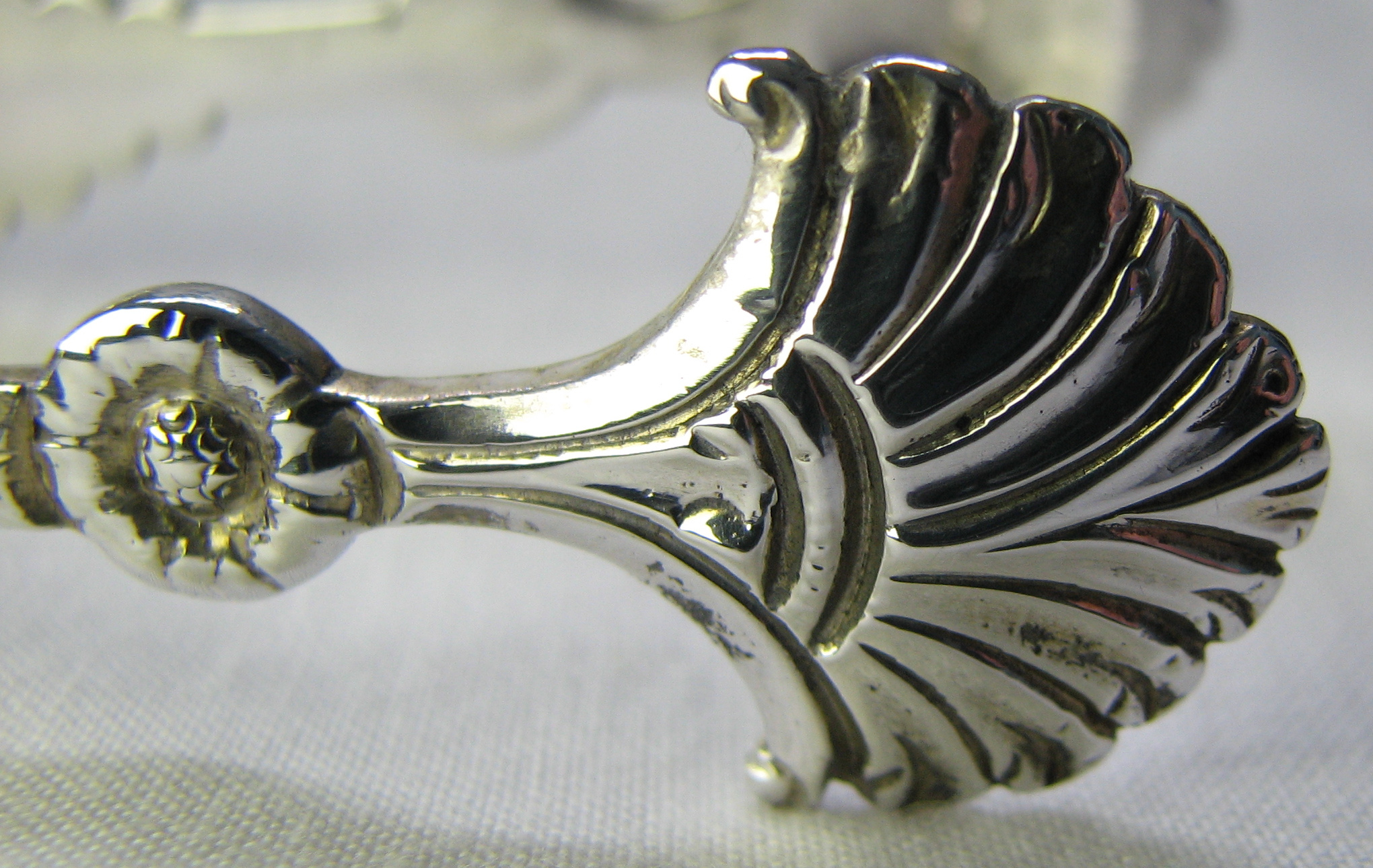 These tongs are a pair of solid cast tongs. They have the half moon shell bowls, with a small circular piece just above the bowls. Despite them being solid rather than open work, they still have a repair, as is common with most cast tongs. What make these tongs interesting is that they are marked with the earlier maker's mark, probably one registered in 1755 or 1758. This will certainly mean they were made before 1767 when the script maker's mark was registered. Click on any picture to enlarge |