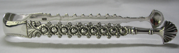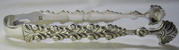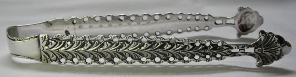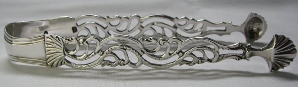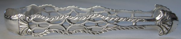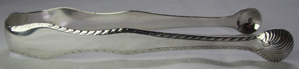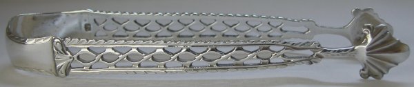 Richard Mills registered his first mark as a largeworker on 14th July 1755. He registered more marks in 1758 and 1760. He then registered additional marks from his new address in 1765 and 1767. I have tentatively dated all of his tongs at around 1767 although they could be a little earlier or later. Grimwade records some confusion over this maker & his dates, however, the mark is very clearly his. You can also see tongs by Thomas Hannam & Richard Mills, a mark that has some doubt over it. Click here to see tongs by Thomas Hannam & Richard Mills. Click on a picture for more details |
