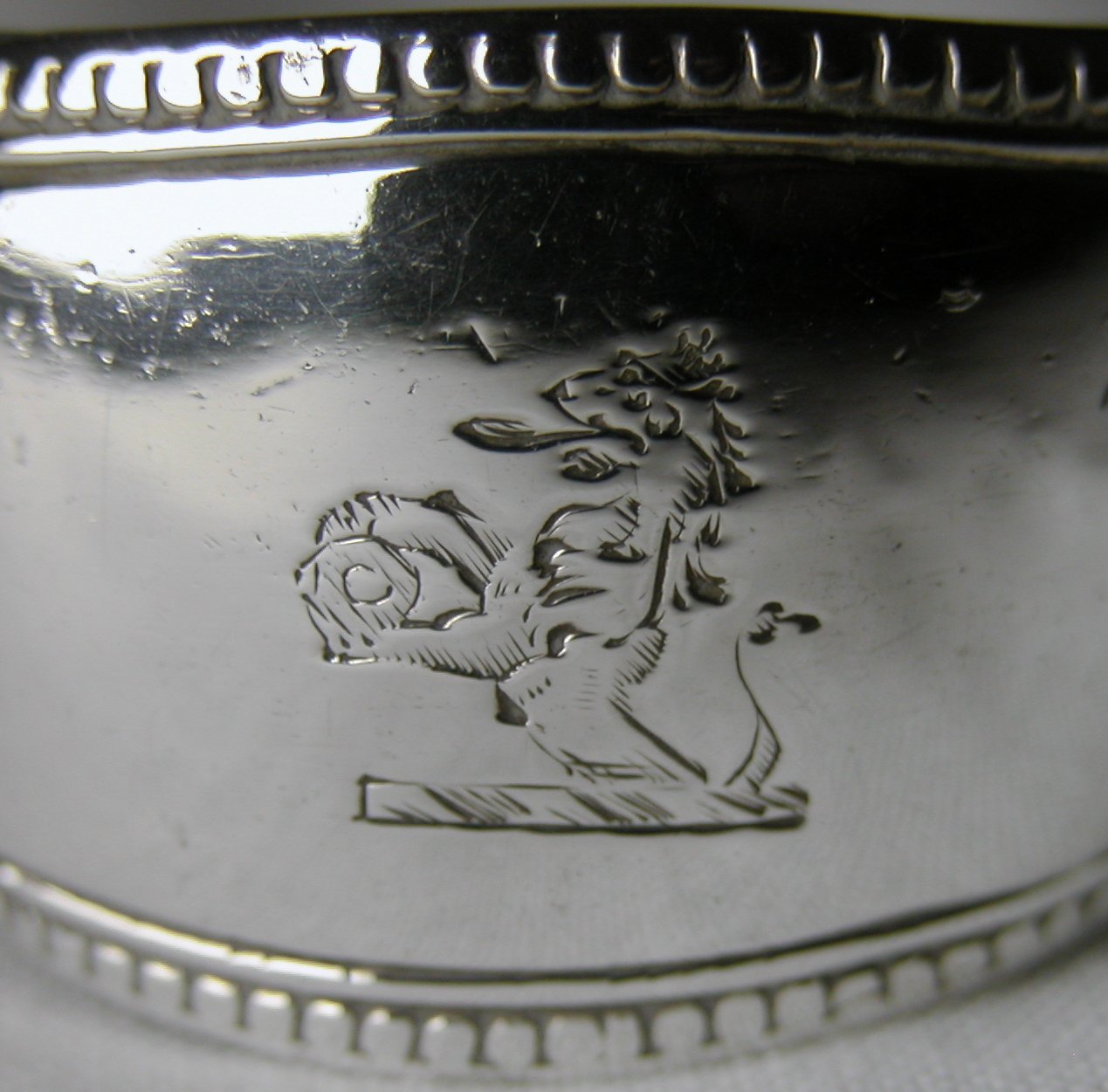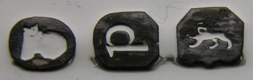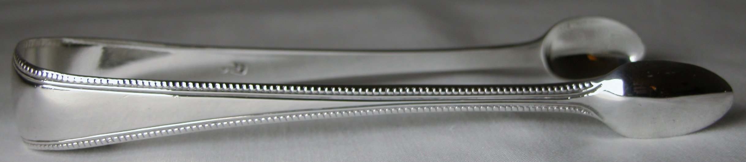 These are lovely pair of beaded and thread edged edged tongs. It is unusual to see beaded tongs dated as late as these, 1819/20. They are also blessed with a delightful family crest of a Lion holding something.