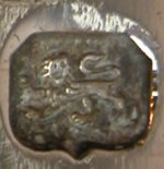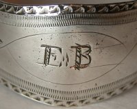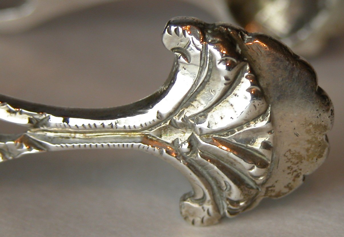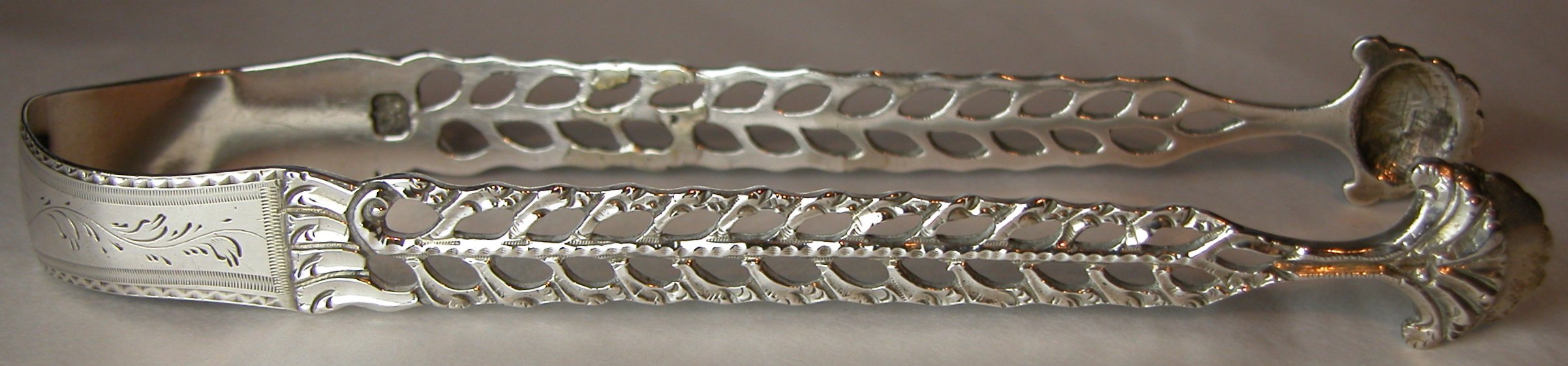 I have dated these tongs at around 1770. They have a nice "Adam" style engraving in a leaf pattern to the top of the arms. They have an unfortunate repair to one arm, although from the front it is not too bad. The maker's mark is poorly struck, but this is not unusual for cast sugar tongs. Click on any picture to enlarge |