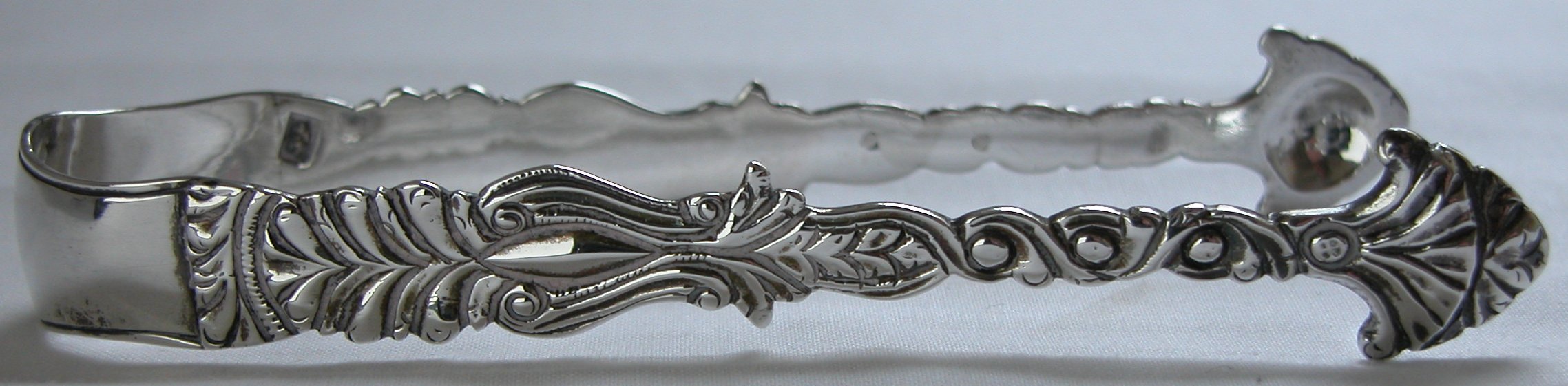 I have dated these tongs at around 1775. They are slightly unusual in that the arms are "solid", i.e. have no pierced parts. They have a very interesting "2 dots" on the inside of one arm. Is this where a sample has been taken, perhaps for assaying? Other than this, they are perfect. Click on any picture to enlarge |
