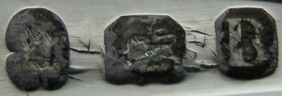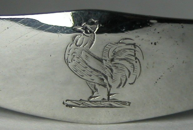 This pair of tongs are very special. The arms are at right angles to the body This is seen more often with cast tongs, or sometimes bright cut tongs but rarely on plain tongs. This pair are plain and have a delightful monogram of a cockerel. They are dated 1797/98 and because of the clipped duty mark, this will be after 6th July 1797 when duty was increased. Click on any picture to enlarge |