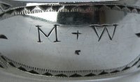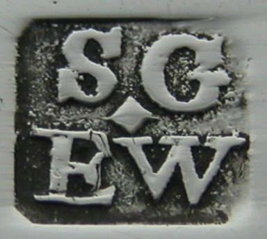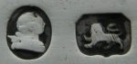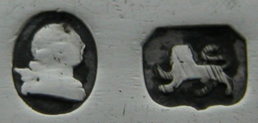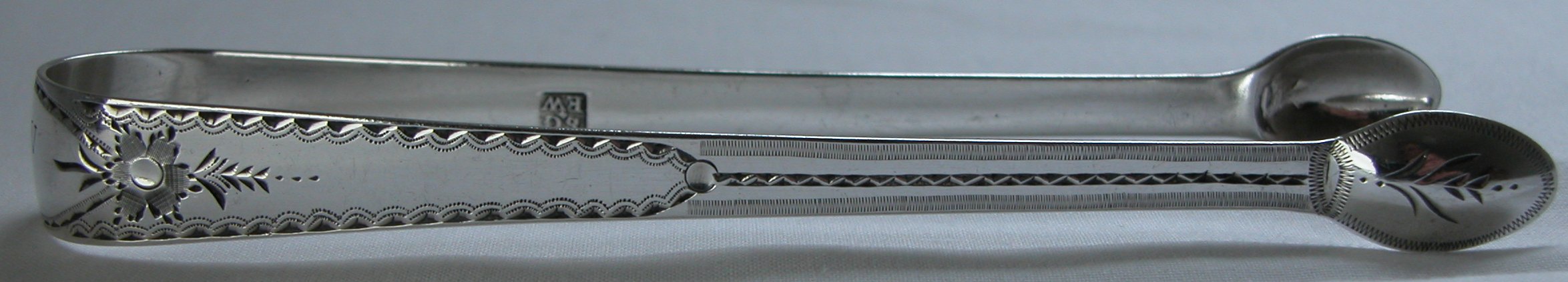 This is a standard straight pair of bright cut tongs. These are interesting because they carry the rare, early maker's mark clearly showing the pellet. They are dated 1790/91. 1789 saw the introduction of a new, smaller maker's mark. Click on any picture to enlarge |