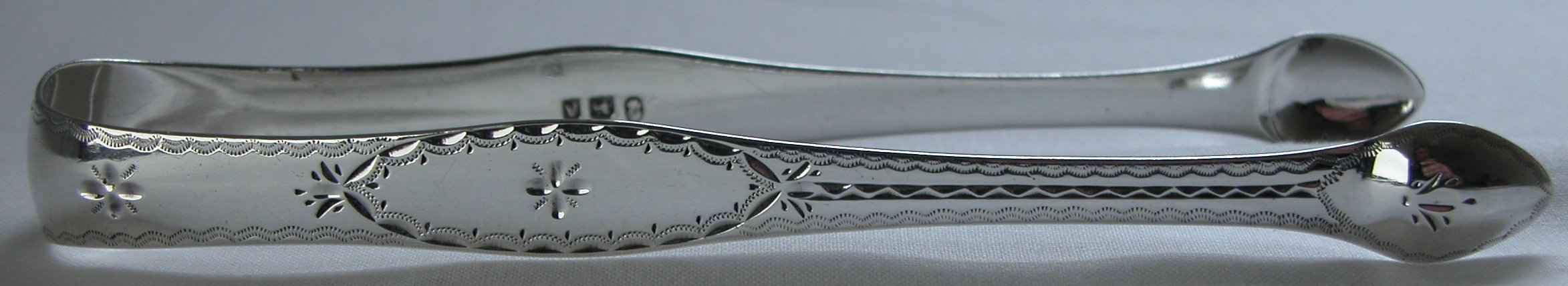 This is a standard pair of flared bright cut tongs, dated 1796/97.