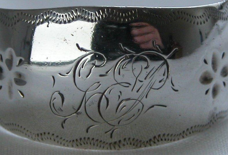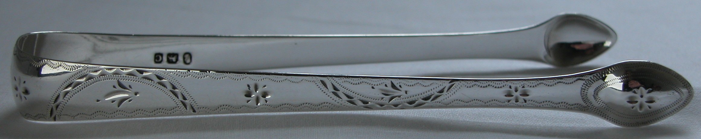 This is a standard pair of straight bright cut tongs, dated 1798/99. This pair of tongs have a lovely winding pattern.