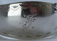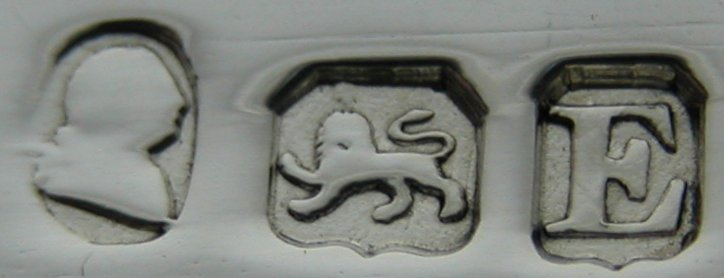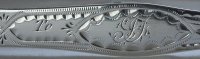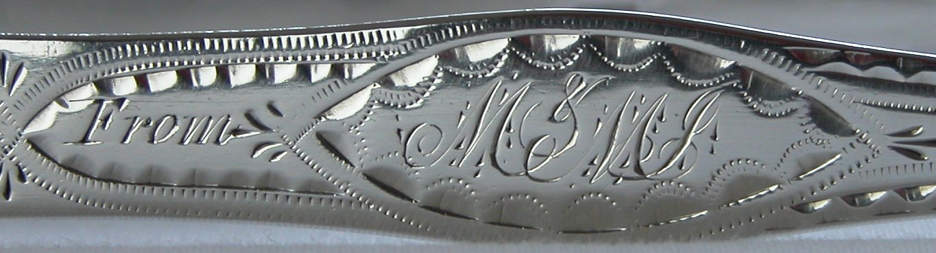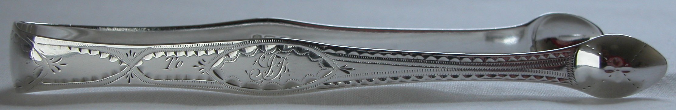This pair of tongs is a fairly standard bright cut, flared example. They are interesting because they were obviously given as a gift and the giver wanted to to show this by having a From and To engraved on them. They are dated 1800/01. Click on any picture for more details |