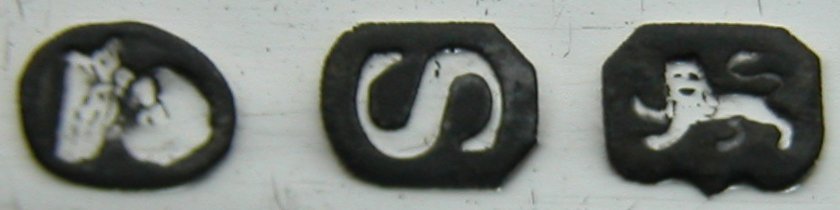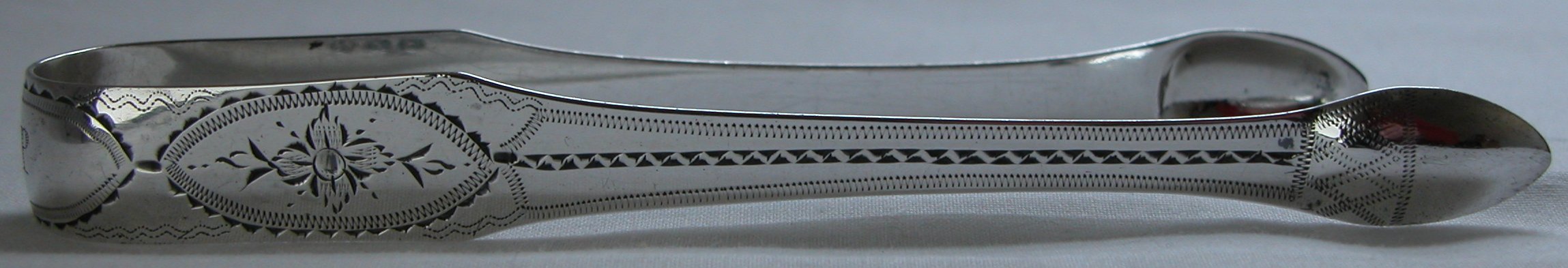 This pair of tongs is a standard bright cut, straight example. Notice that the top half of the arms are straight rather than tapered. This is quite unusual and rather like fiddle pattern tongs. They are dated 1813/14. Click on any picture for more details |