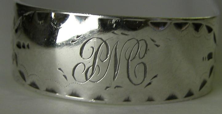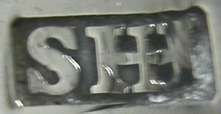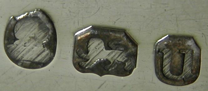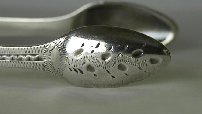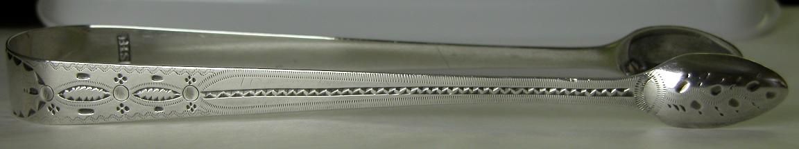 These tongs are a pair of bright cut tongs and are fairly un-remarkable except that the maker's mark has been struck twice. The first strike obviously had not been struck properly. They are dated 1795/96.