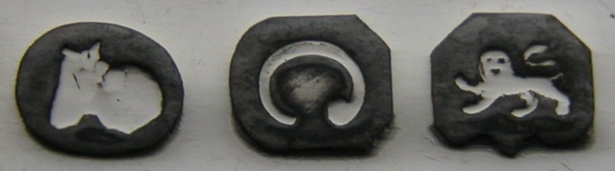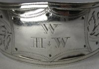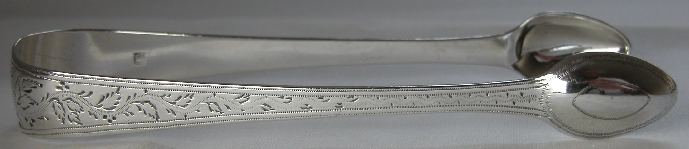 Solomon Royes & John East Dix registered a mark together on 19th September 1818 and Solomon Royes registered a mark on his own on 22nd February 1820. As they were only working together for 20 months, sugar tongs by this partnership are very rare. This pair is bright cut over the whole length with a lovely trailing leaf pattern engraved to the top half of the arms. They are quite chunky, with large bowls, which was standard for this period. With the date letter “C”, these tings can be accurately dated between 19th September 1818 and 29th May 1819. Click here to see tongs by Solomon Royes. Click here to see tongs by Solomon Hougham. Click here to see tongs by Solomon Hougham, Solomon Royes & John East Dix. Click on any picture to enlarge |