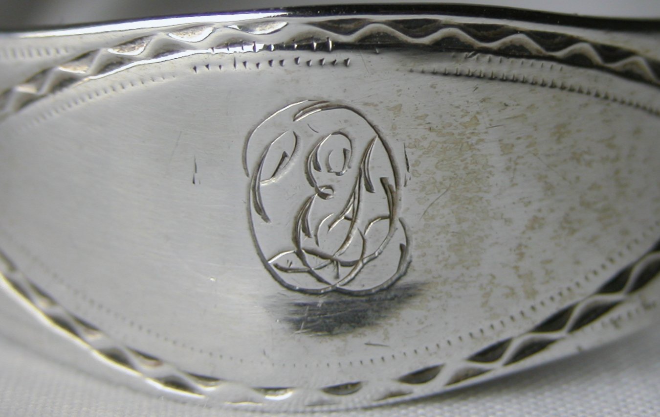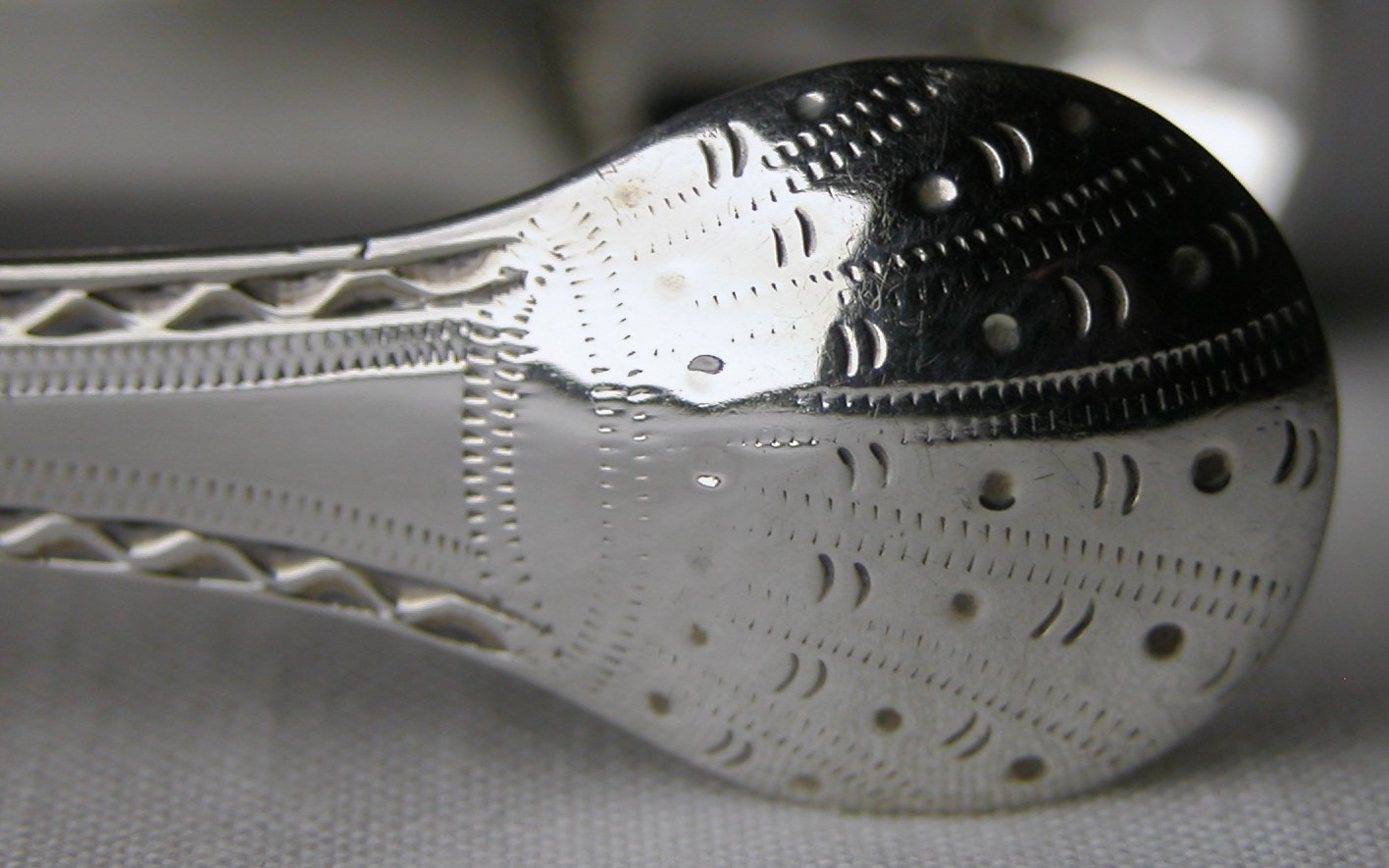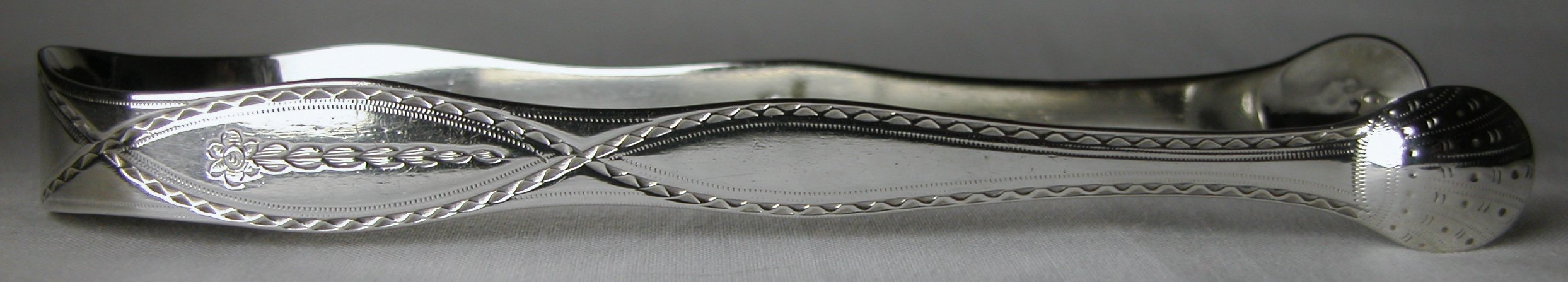 These tongs are a gorgeous shaped style, bright cut engraved and with circular bowls. I have dated them as c1780-84