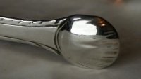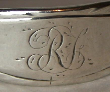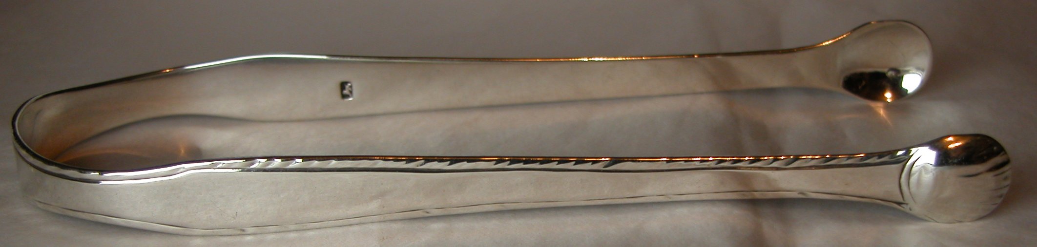 This is a pair of flared tongs, with a true feather edge and circular bowls. These will probably be dated around 1778 - 1780.