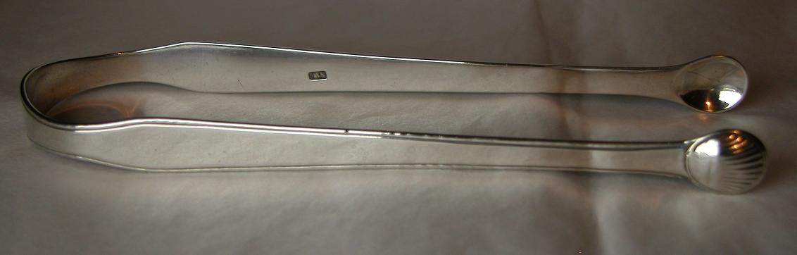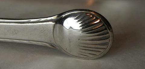 This is a pair of flared tongs, very similar to the previous pair, but this time with a thread edge rather than a feather edge. These tongs also have circular bowls. These will probably be dated around 1778 - 1780.