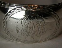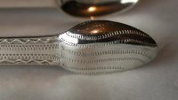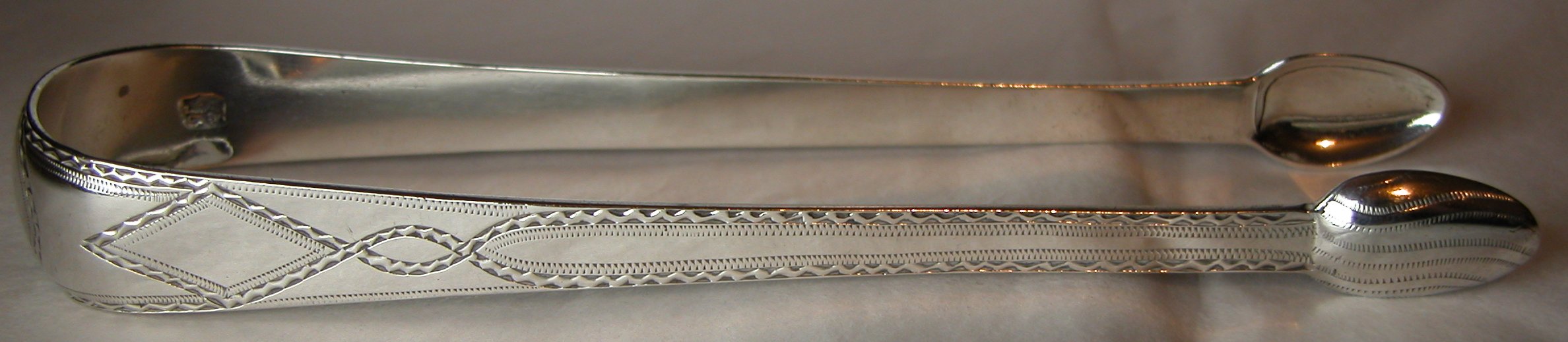 This is a pair of standard style bright cut tongs, they have an elaborate monogram and are dated c1780 - 1784