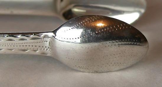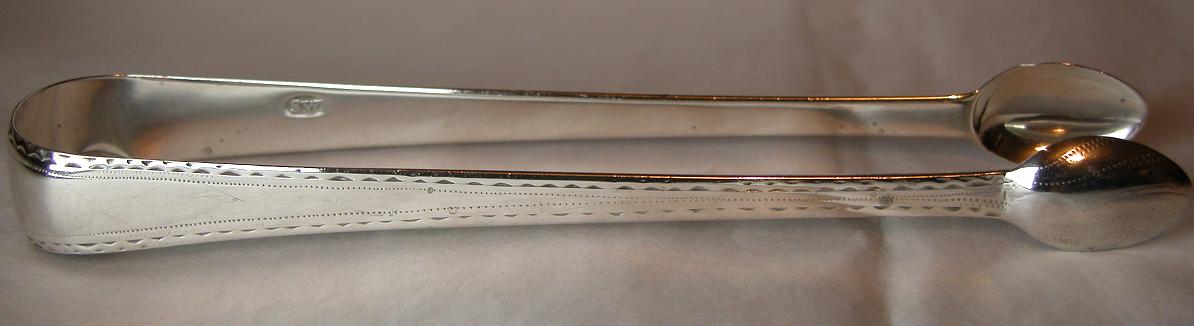 This is a pair of standard style bright cut tongs. The engraving is a simple feather edge style, but is very worn - from too much polishing! The Lion Passant is also worn. They are dated c1780 - 1784.