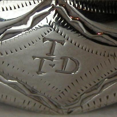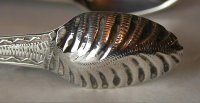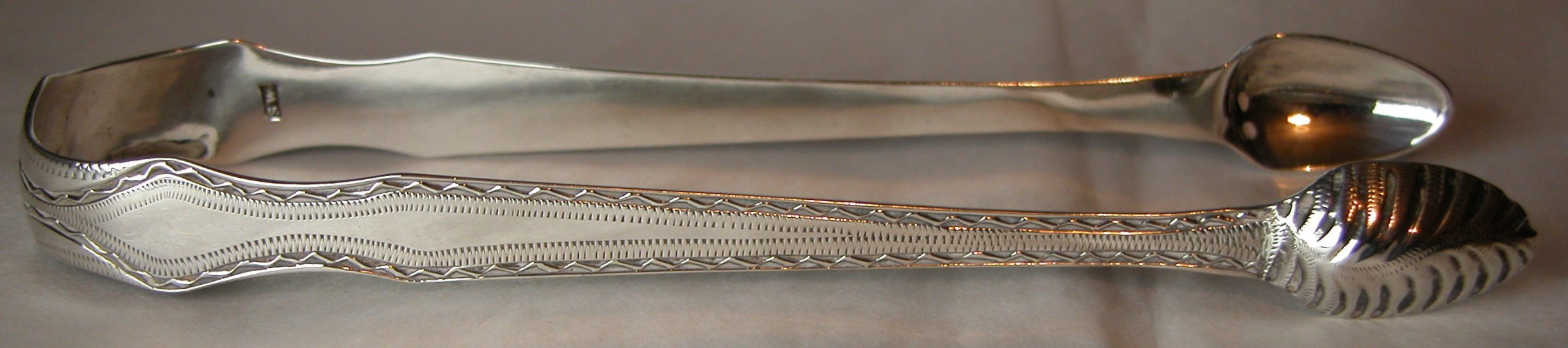 These tongs have a lovely elaborate double flared shape, with bright cut engraving on the arms and a deep veined engraved pattern on the bowls. The monogram is a betrothal monogram. They are dated c1780 - 1784.