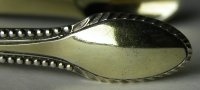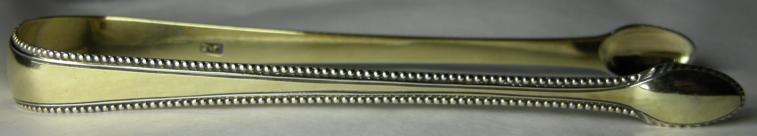 This is a beautiful pair of silver sugar tongs. The lovely golden colour comes about because they are gilded. The gilding is Gold and is often know as "Lemon Gilding". The style is a very simple thread and beaded edge. Click on any picture to enlarge |