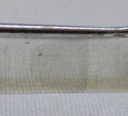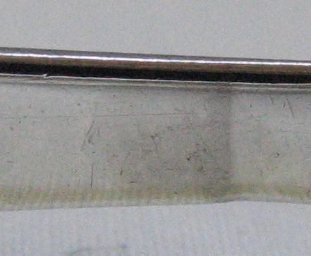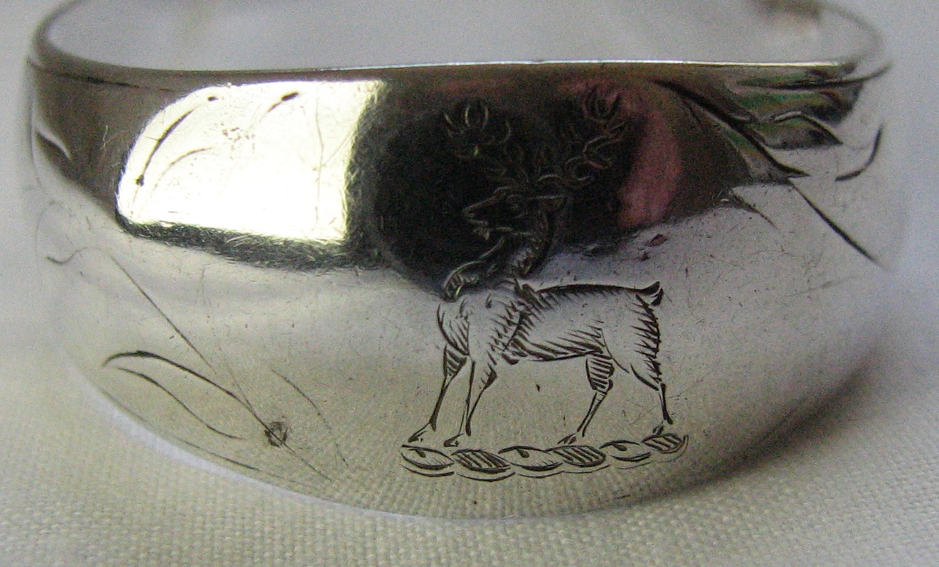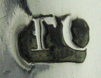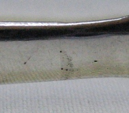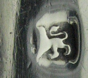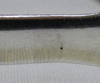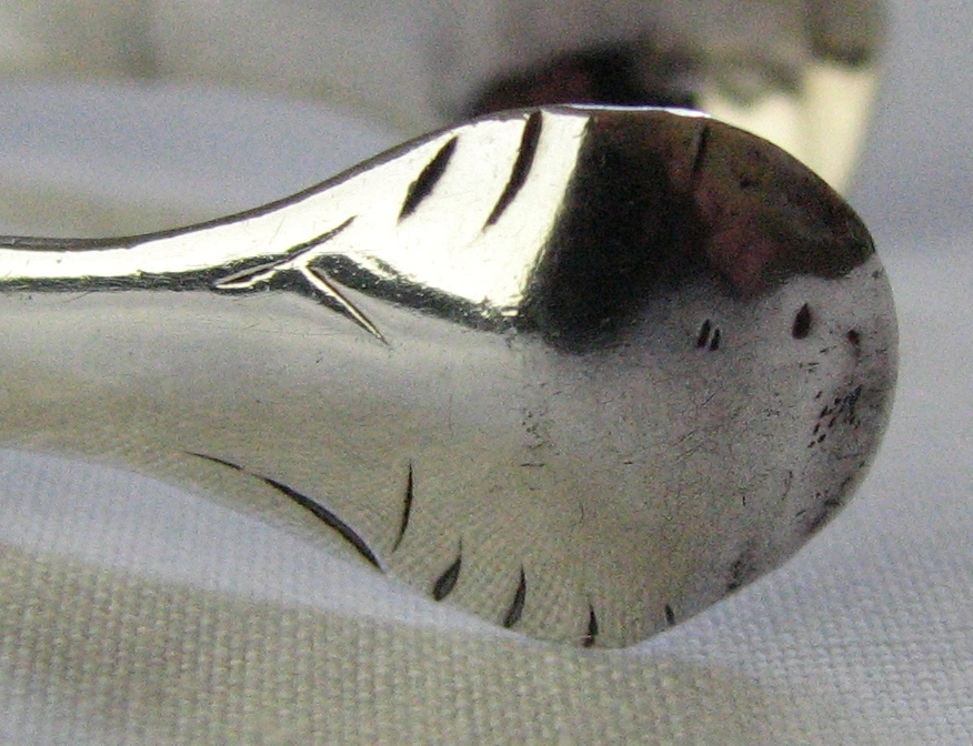 This is a shortened pair of tongs. They are 4.¼ inches or 10.5cms long. The joins where they have been repaired can clearly be seen about ½ inch up from the bottoms of the bowls. It appears that between ½inch and 1 inch of the arms has been removed. Whether this was done at the time of manufacture or sometime later is debatable. These tongs are typical Thomas Chawner in style with a delightful monogram of a stag. I would date them at c1775 - 1780. Click on any picture to enlarge |