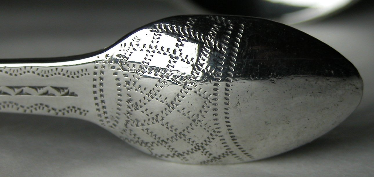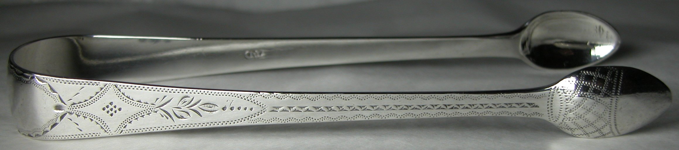 This a pair of bright cut tongs, with a patterned bowl giving the illusion of acorn bowls.