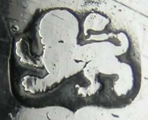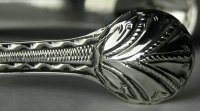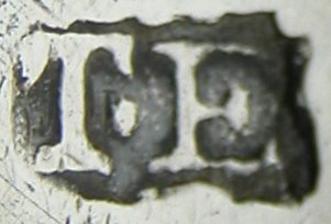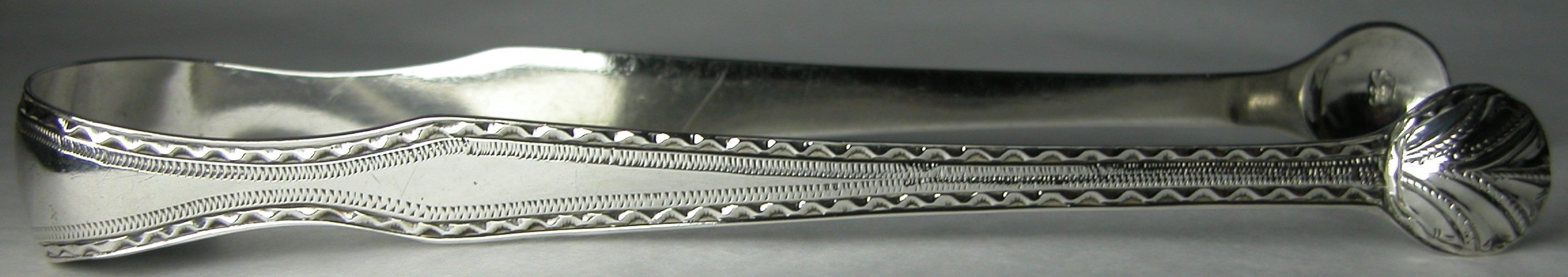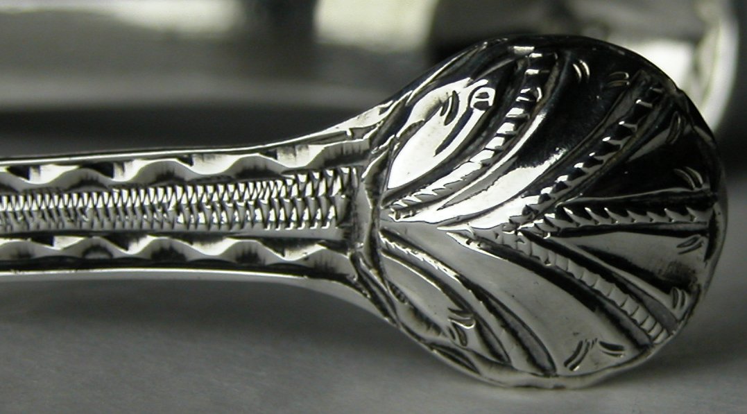 This is a lovely pair of early bright cut tongs. They are flared and have circular bowls. Like lost Thomas Evans tongs they are marked in the bowls.