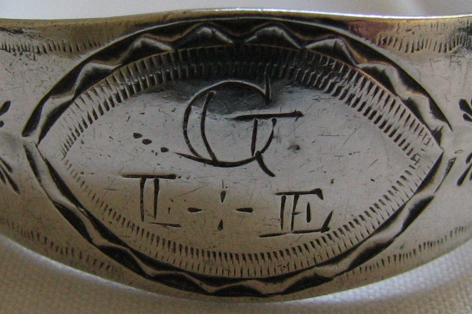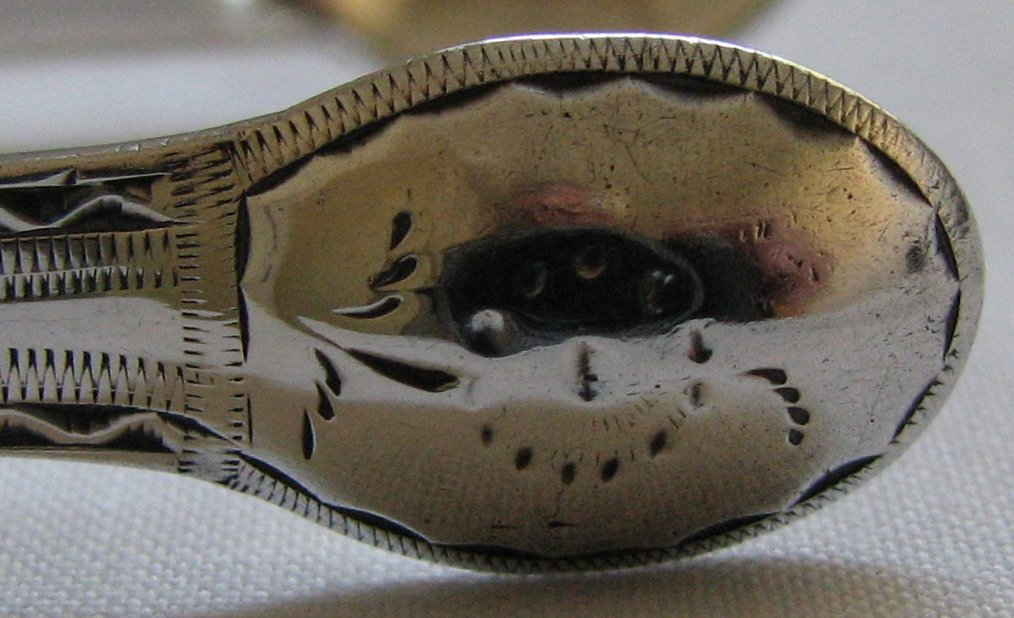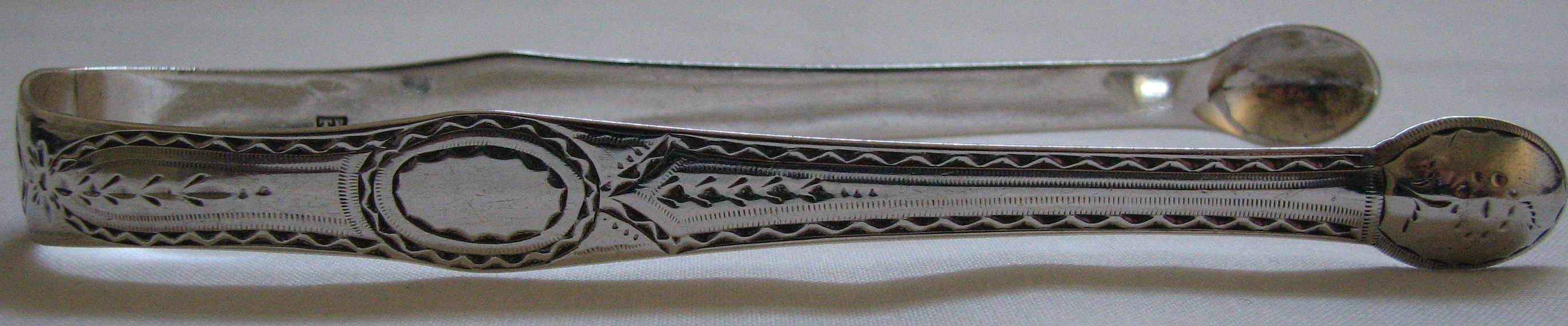 This pair of tongs is another pair of flared bright cut tongs, again with clear hallmark and maker’s mark. This pair has a betrothal monogram.