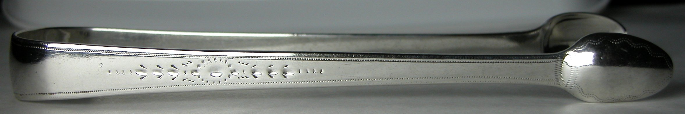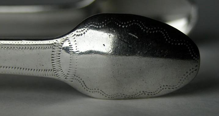This is a fairly standard pair of tongs for the period. They are bright cut to part way down the arms and have an interesting light prick dot pattern edge all the way around the tongs. They are dated 1806/07.