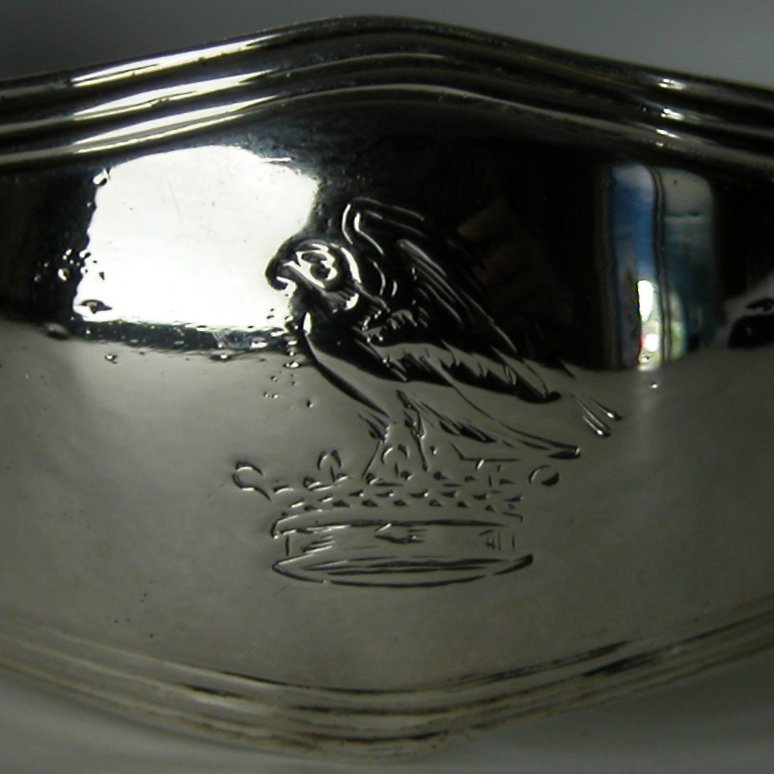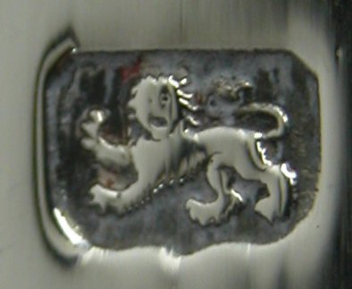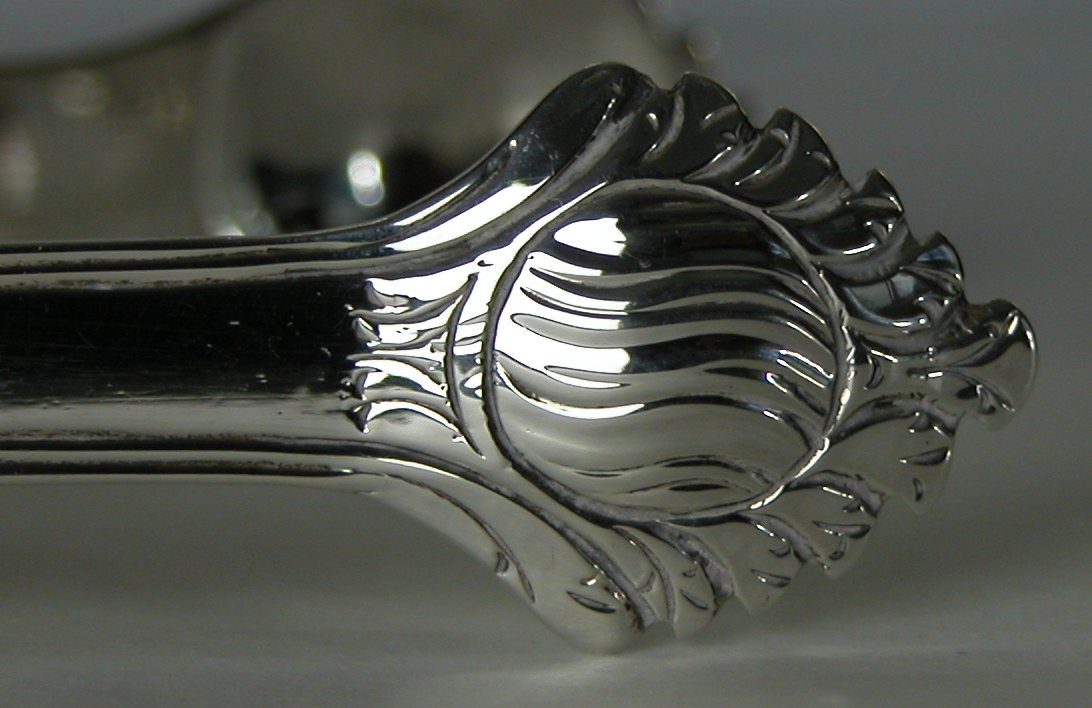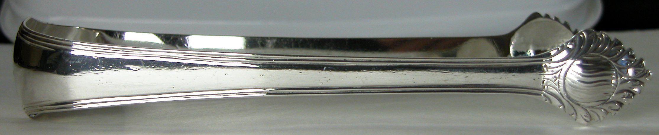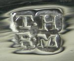 These sugar tongs with the TH RM mark are plain, with a thread edge and shell bowls, dated c1780. This is possible given the dates of the other marks. In fact these sugar tongs are very unusual. In appearance they have a shiny finish to them that makes them look almost like silver plate. The bowls are very distinctive and there is a monogram of a hawk on sitting on a crown. Click on any picture to enlarge |