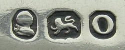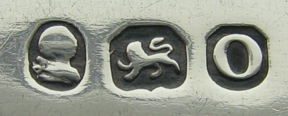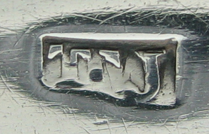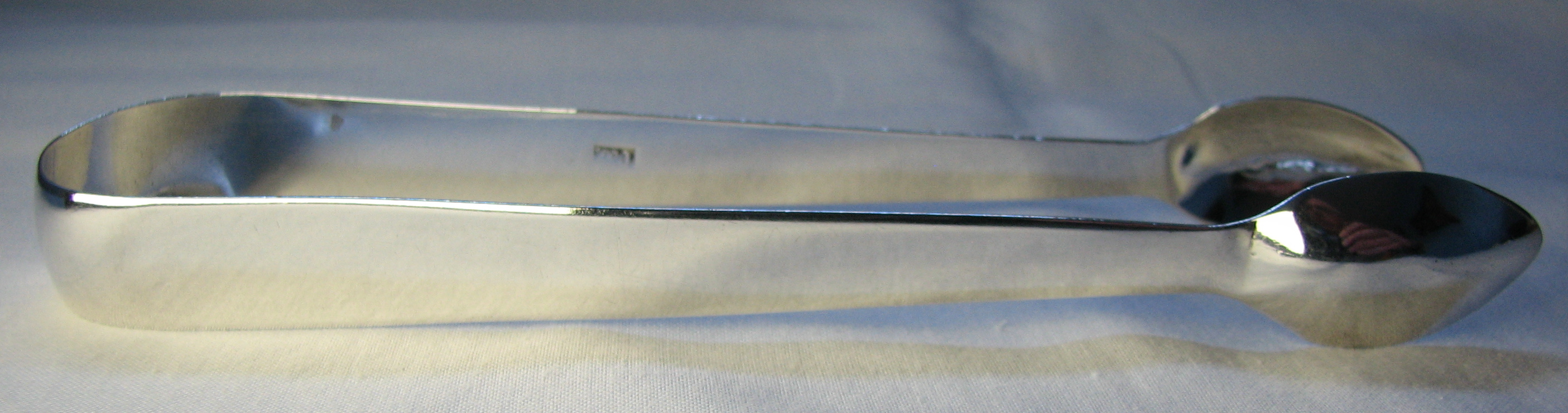 This is a plain "Old English" style pair of tongs. They are dated 1809/10. Whilst it looks very like there is a pellet on the maker's mark, it is difficult to be sure as the mark has been overstruck over another maker's mark.