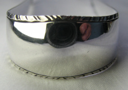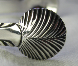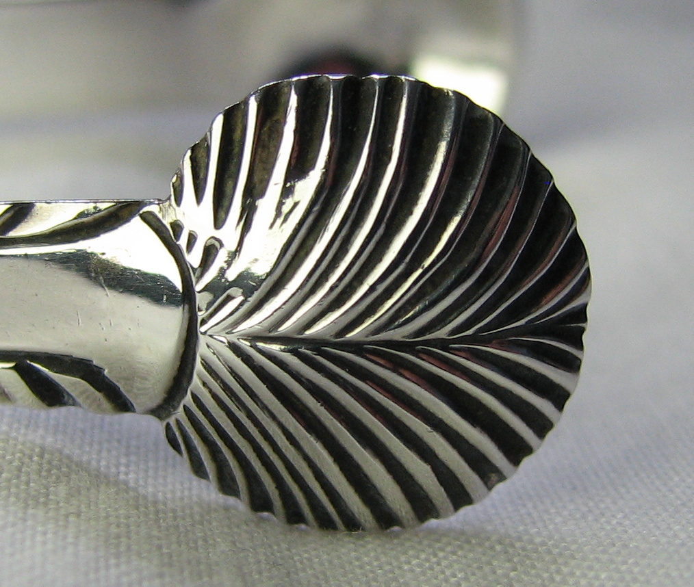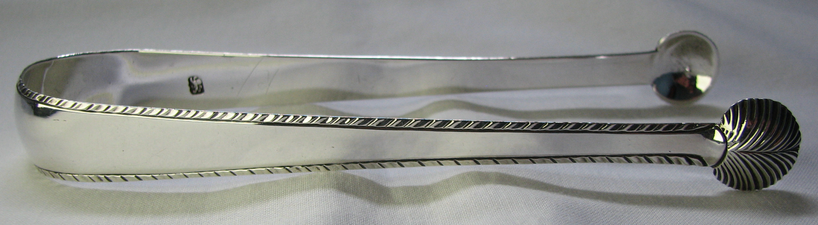 Thomas Moore III registered his first mark as a small-worker in partnership with John Bourne. That mark was entered by power of attorney. They appear as buckle-makers in the parliamentary report of 1773. and registered a mark as such on 8th February 1775. It is believed that John Bourne may have been a sleeping partner as he lived in Staffordshire, Thomas Moore went on to register several marks alone as a buckle-maker between 1776 and 1783. Unfortunately we do not have any reliable images of these marks. My attribution of these tongs to Thomas Moore III must be in some doubt, firstly because we have no record of what his mark looked like and secondly it is unclear whether the second letter is even an "M" as the mark is somewhat distorted. The tongs are delightful with feather edging arong the arms and heavily engraved bowls. I have dated them at around 1780. If they are indeed by Thomas Moore III then they will be dated after 1776. These dates are entirely in keeping with the style of the tongs. Click here for tongs by John Bourne & Thomas Moore Click on any picture to enlarge |