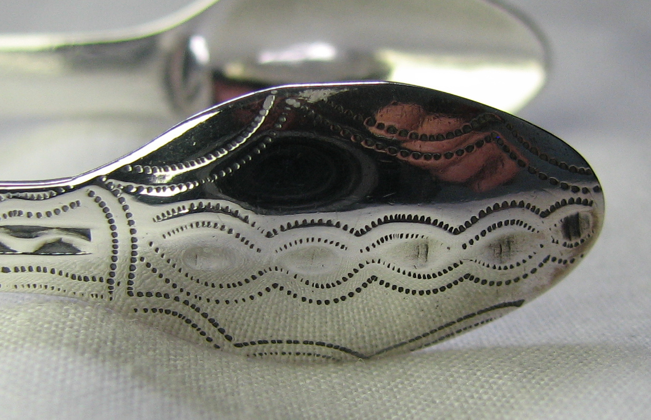 These are a fairly standard pair of bright cut sugar tongs, their style being right for the date. They have a nice interesting pattern on the bowls as do the other Thomas Nash II tongs.