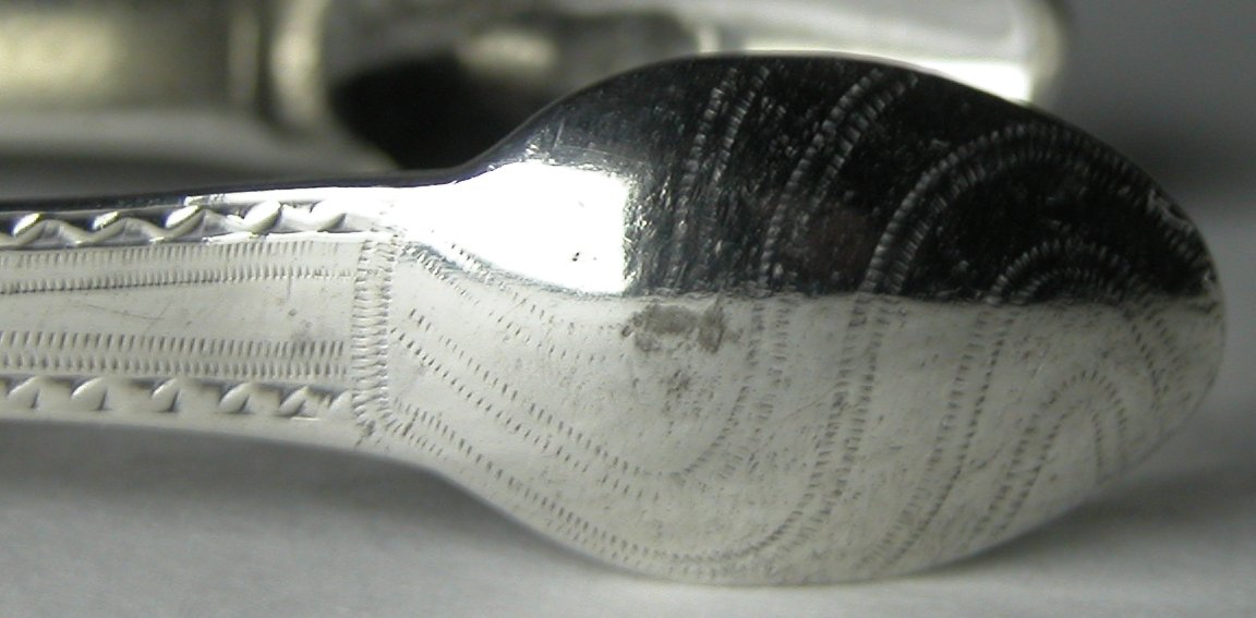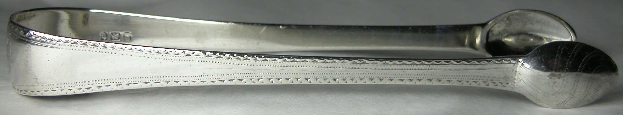 These are fairly standard bright cut tongs. The style is not particularly unusual although the bowls do have an interesting pattern. They are dated 1794/95. Click here to see tongs by Thomas Northcote
