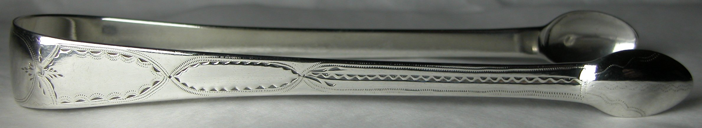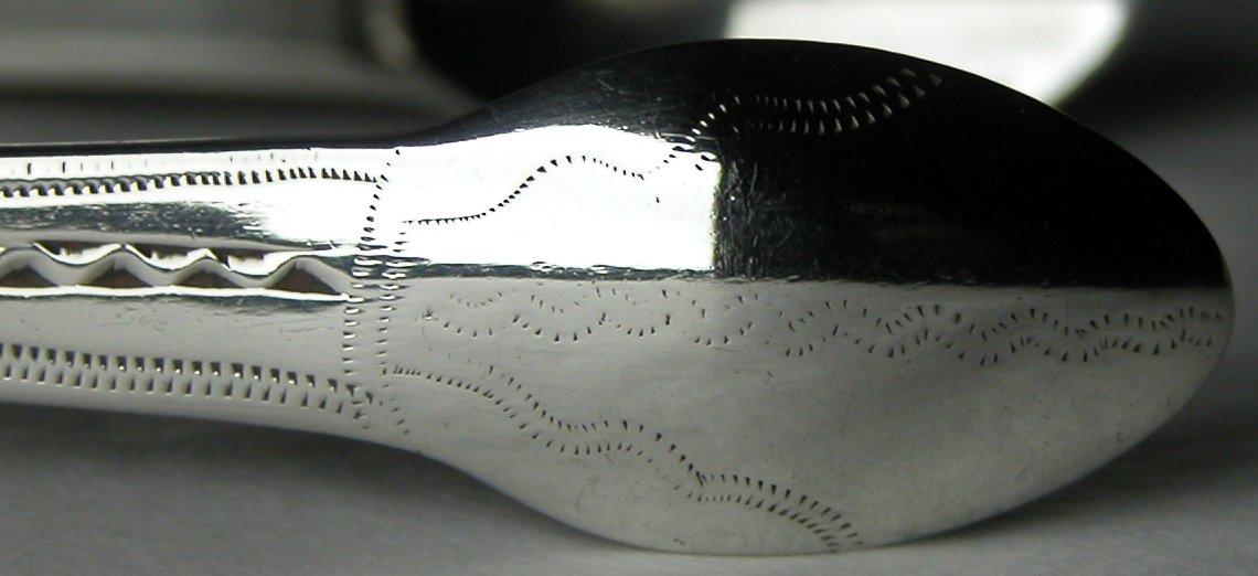 These are also standard bright cut tongs. The style is not particularly unusual although the bowls do have an interesting pattern. They are dated 1795/96. Click here to see tongs by Thomas Northcote