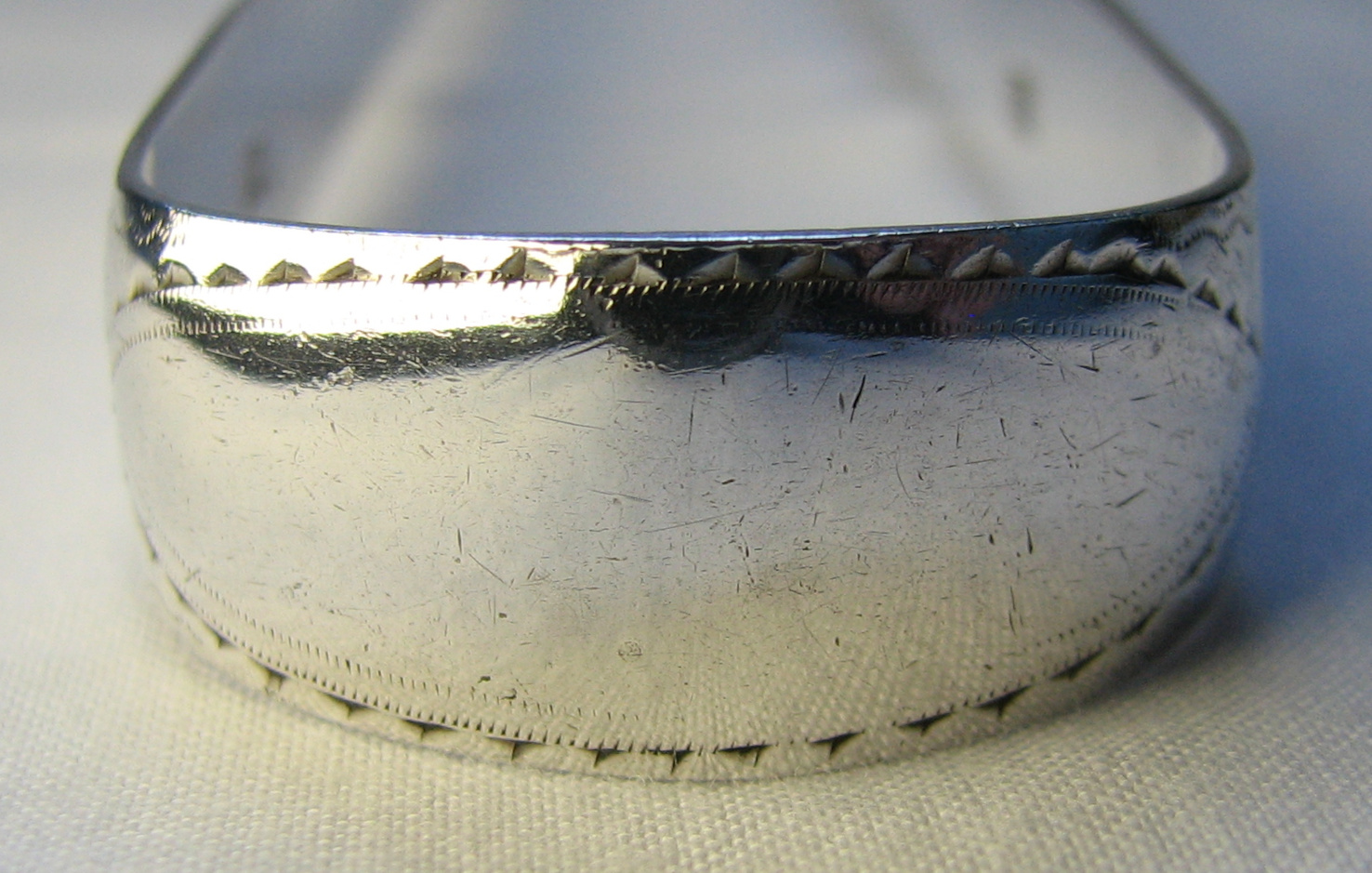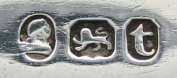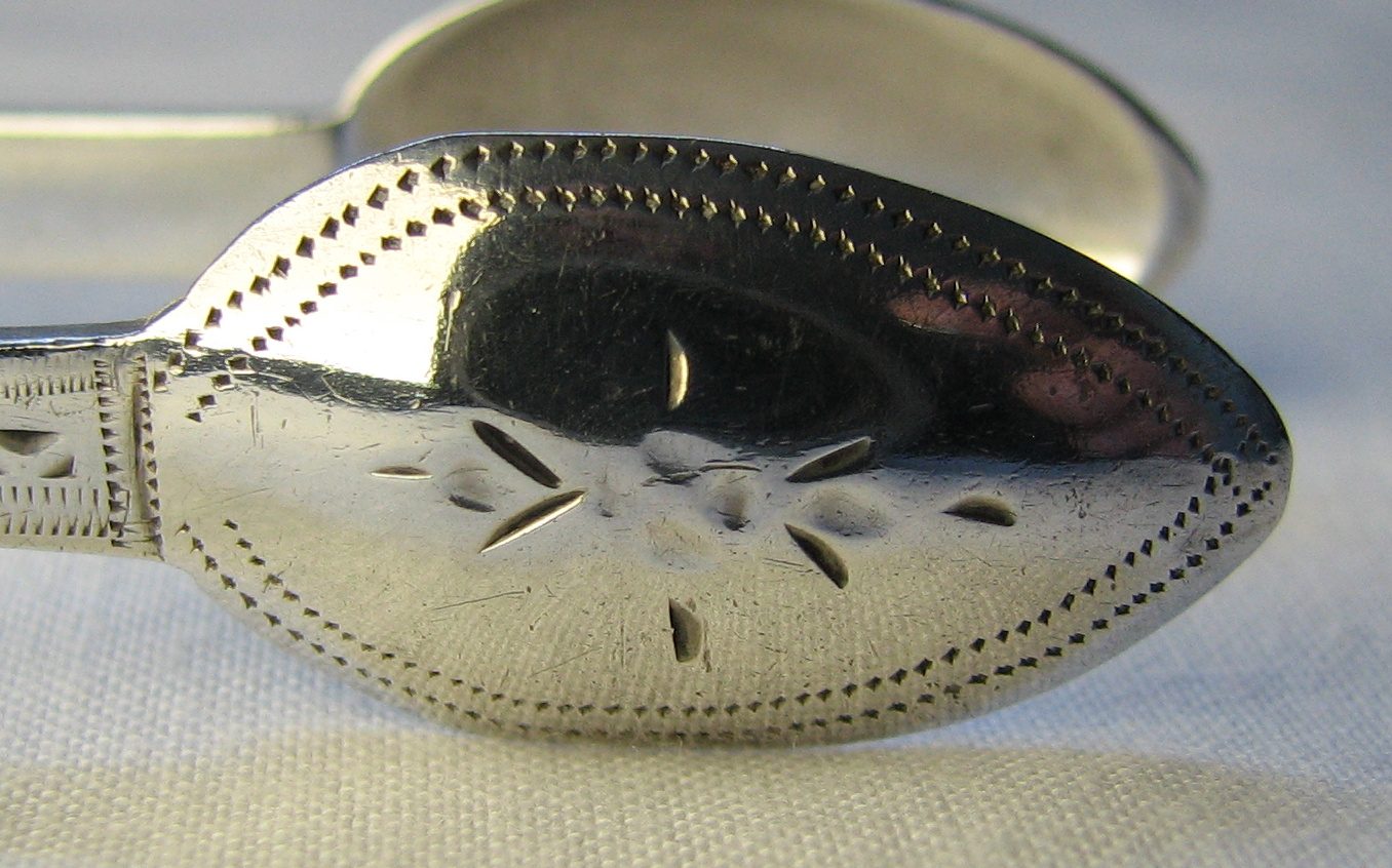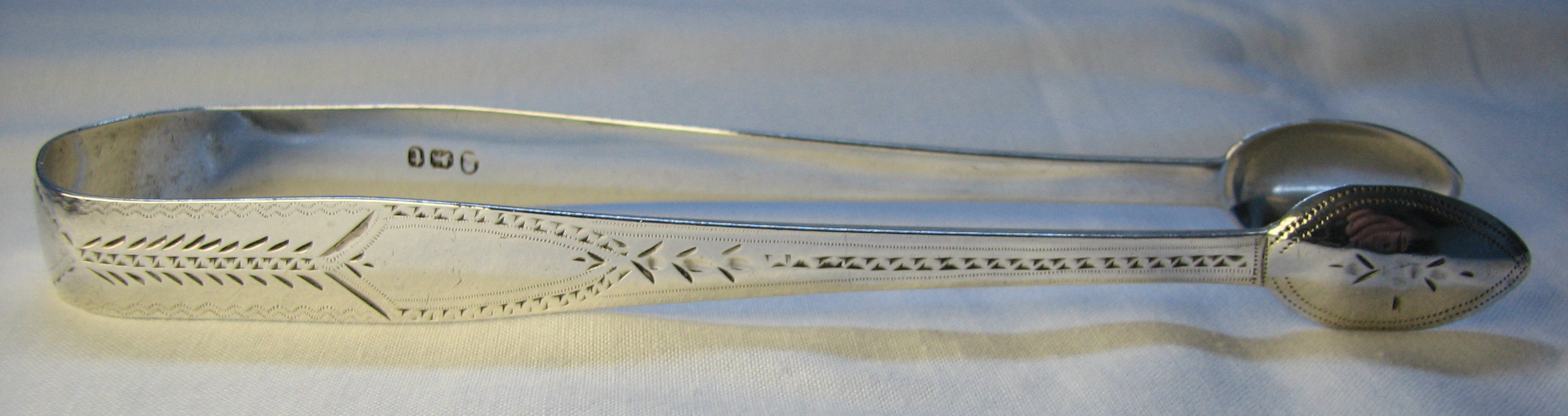 These are a fairly standard style of bright cut tongs, normal for the period. They have a straight side to the top half of the arms, similar to those of Stephen Adams. You can clearly see that the maker's mark has been overstruck but unfortunately cannot see who the actual maker was. They are dated 1794/95. Click here for a pair of Stephen Adams tongs of similar style. Click on any picture to enlarge |