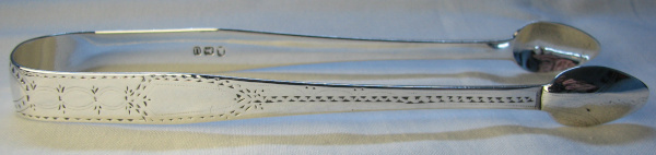 This is an interesting and rare maker's mark, particularly as both pairs of tongs appear to have been overstruck. There are quite a number of makers with the mark "TP" recorded but most are without a pellet. I have plumped for Thomas Pepper I as his mark has a pellet and was registered before these tongs were made. Thomas Pitts I is a vague possibility but Heal only records him working up to 1793, and he was a plate-worker. Thomas Pepper I recorded his first mark as a small-worker in 1767 and another in 1772. Heal records Thomas Pepper as a "Goldsmith and enameller" between 1790 and 1796. Thomas Pepper II recorded his first mark as a plate-worker in 1809. The dates therefore don't quite match up unless Thomas Pepper I was working between at least 1767 and 1796. Given that both of these pairs of tongs are overstruck and therefore not likely to have been made in his workshops, I think Thomas Pepper I is definitely a contender.