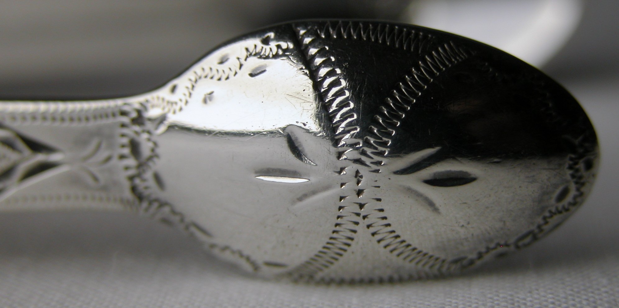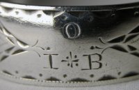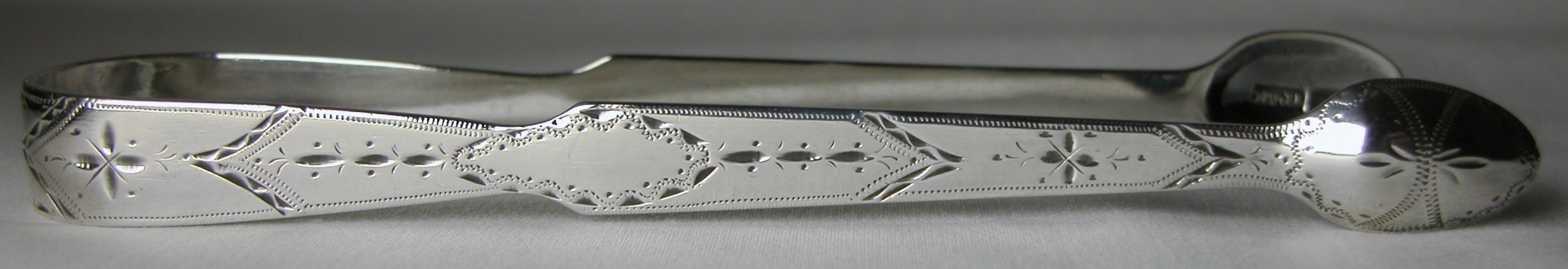 These tongs are flared, shaped bright cut sugar tongs, dated c1780 - 1784. They have unusual shaped arms. The hallmarks are in the bowls and the maker's mark has been overstruck. This is a feature of all the tongs by Pratt & Humphreys, suggesting that they did not actually make them but bought them from another maker. Click on a picture to enlarge |