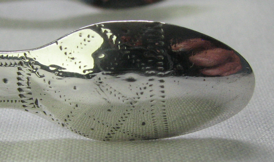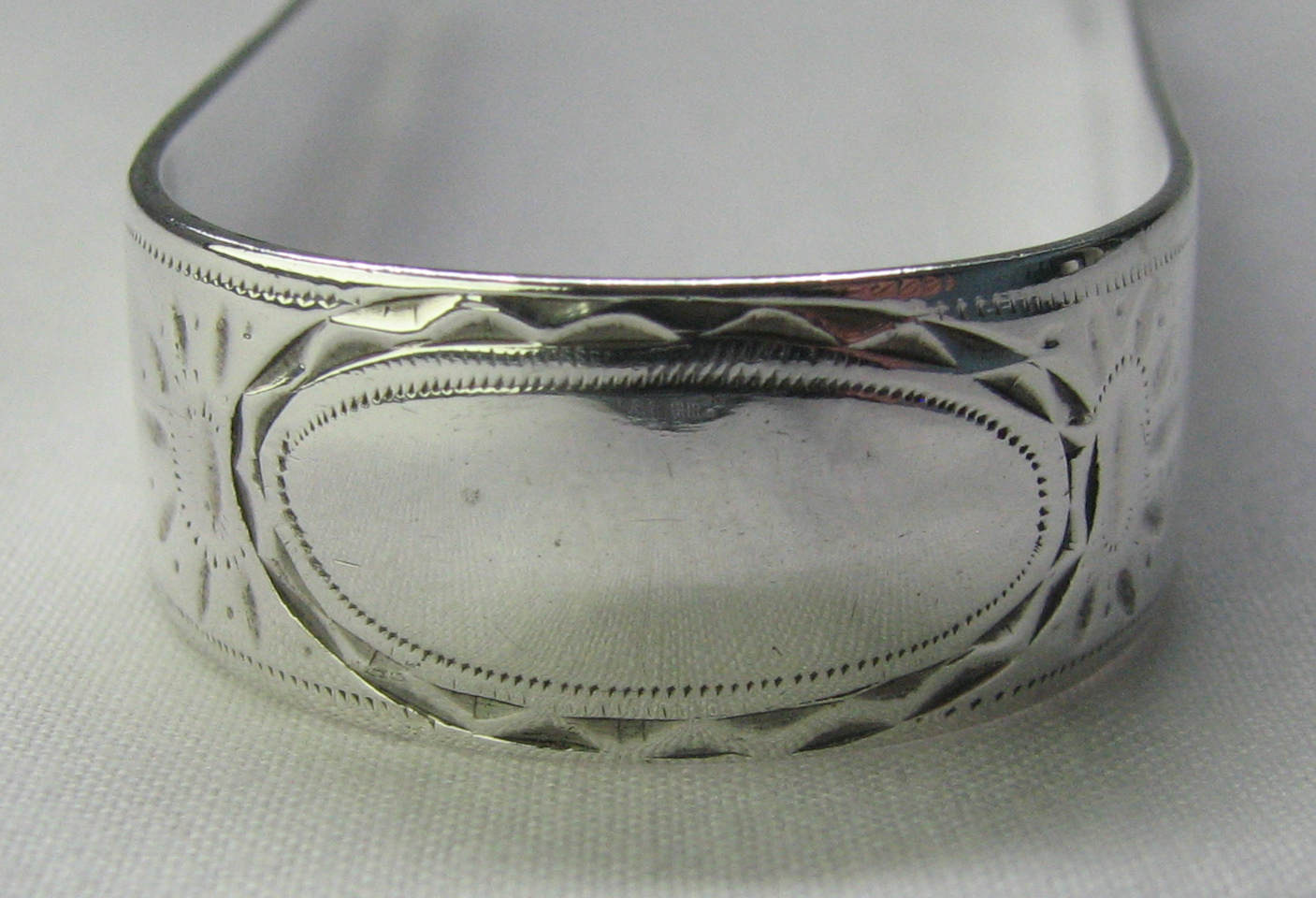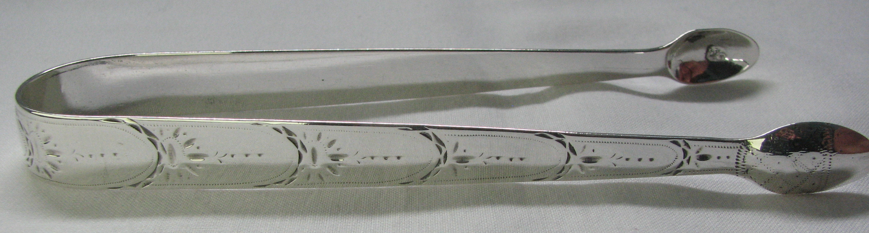 These tongs are simple straight sided bright cut engraved tongs with a lovely repeated pattern down the arms. The proportions are just slightly different to most London tongs of this period, not quite tapering as much as most.They are dated c1780 - 1784. The hallmarks are in the bowls and the maker's mark has been overstruck. This is a feature of all the tongs by Pratt & Humphreys, suggesting that they did not actually make them but bought them from another maker. Click on a picture to enlarge |