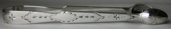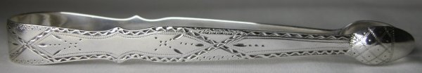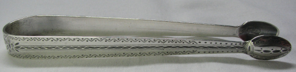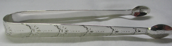 Thomas Pratt & Arthur Humphreys entered their mark as plate-workers on 7th July 1780. It is interesting to see silver sugar tongs by these makers as there is no record of them having been spoon-makers or small-workers. These tongs are flared, shaped bright cut sugar tongs, dated c1784. The style and pattern of these sugar tongs is interesting, being unique, although with some similarities to much later Bateman silver sugar tongs and some similarities with early provincial bright cut sugar tongs. The hallmarks are in the bowls. Click on any picture for more details |