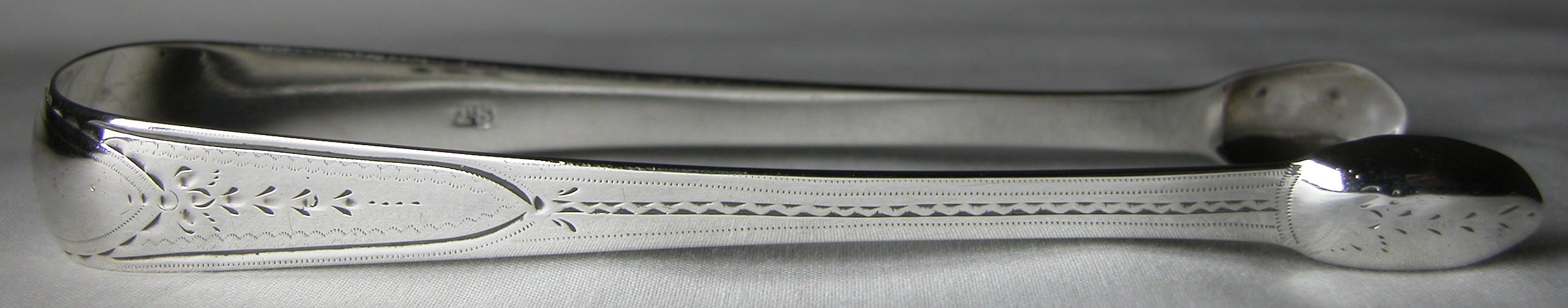 This is a pair of very ordinary bright cut tongs with a betrothal monogram, dated 1796/97.