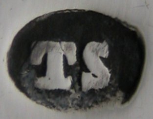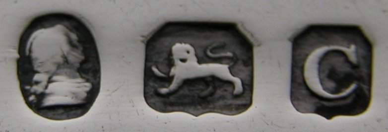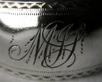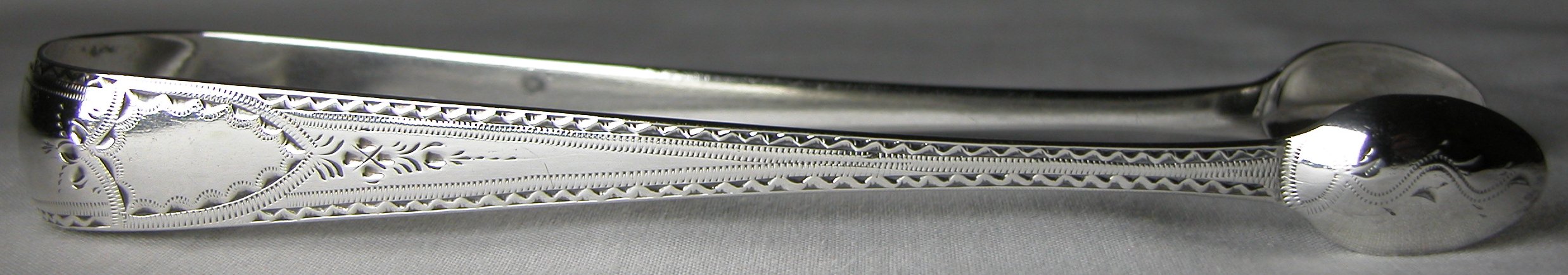 This is a pair of fairly standard bright cut tongs but notice the blank shield shaped cartouche to the tops of the arms. The monogram is engraved on the bow. The maker's mark on these tongs is quite different to the others but the same as the other pair dated 1798/99. Click on any picture to enlarge |