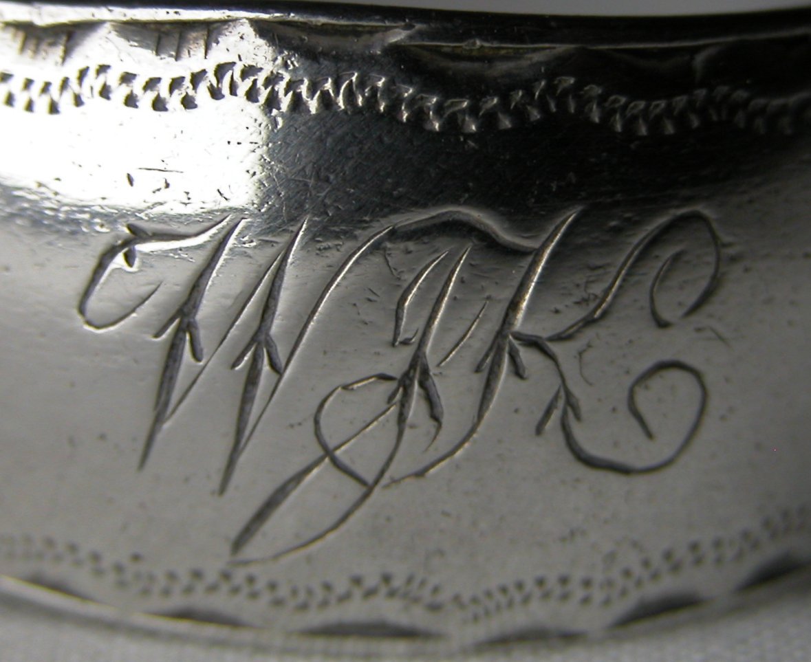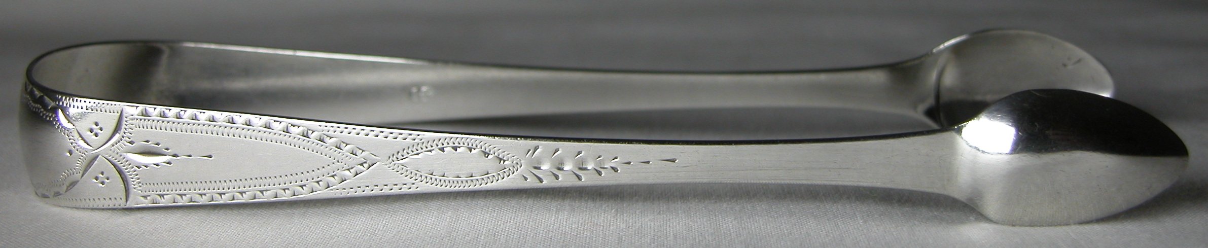This is a pair of bright cut tongs, engraved to the top half of the arms only, with plain bowls. They are dated 1801/02.