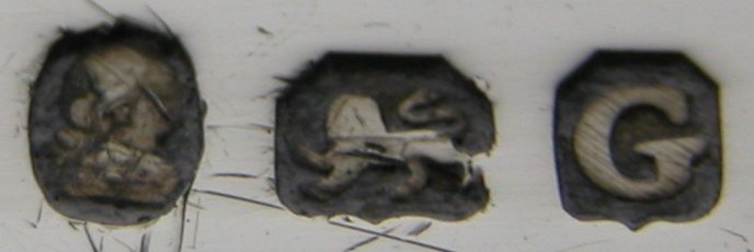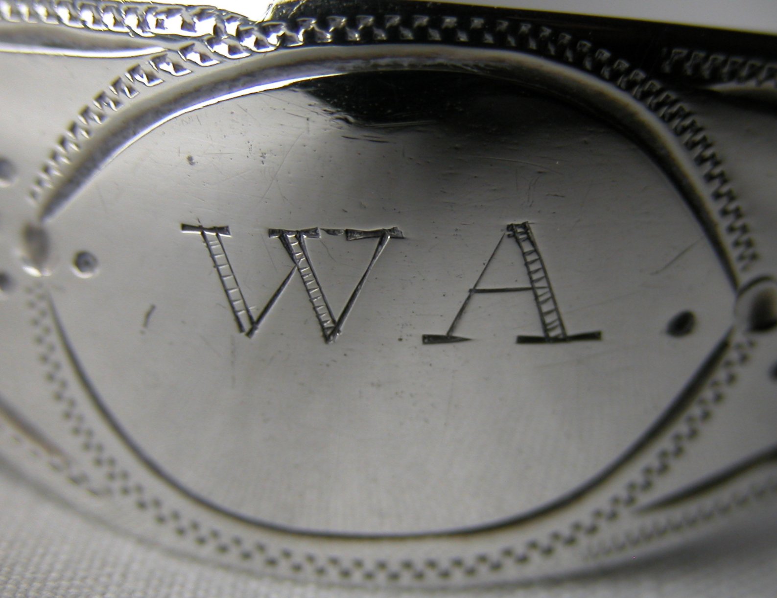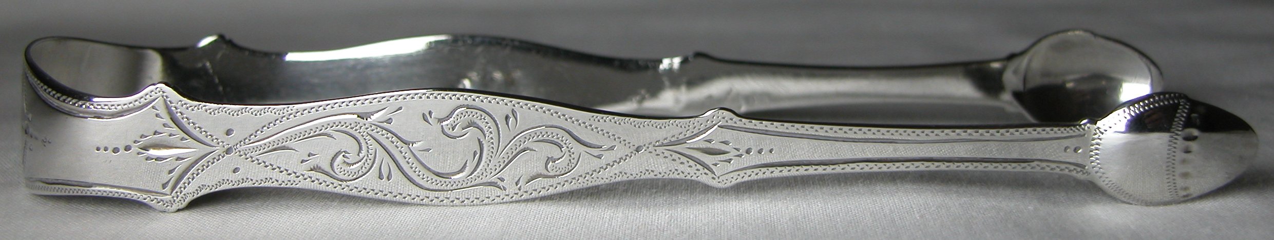 This is a pair of flared bright cut tongs. These tongs are almost certainly Bateman tongs which will have been bought by Thomas Streetin and marked with his own mark. They are dated 1802/03.