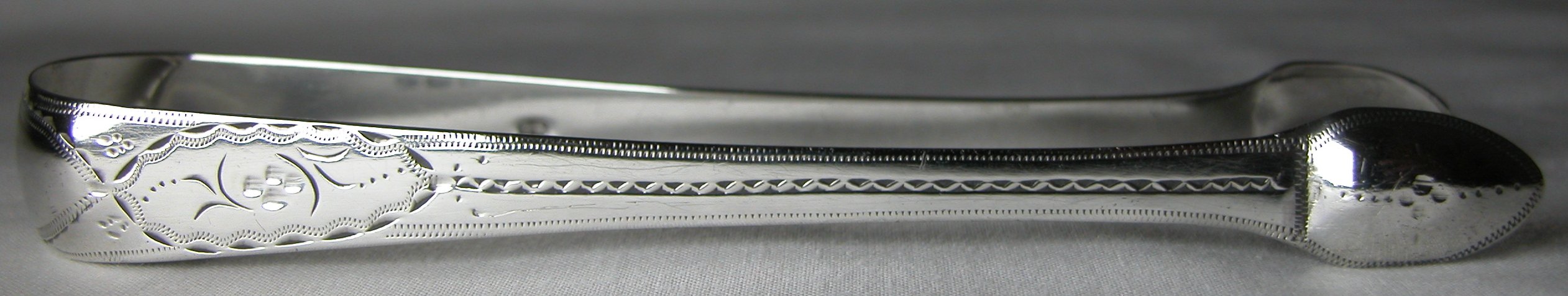 This is a pair of very ordinary bright cut tongs, dated 1807/08.
