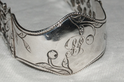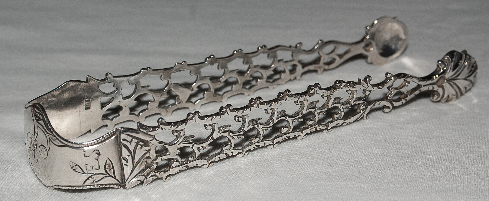 This is a pair of cast tongs with "Adam" style engraving around the bow, made around 1770 - 1775. They are clearly marked with the maker's mark of "TT". This mark has a pellet between the letters.