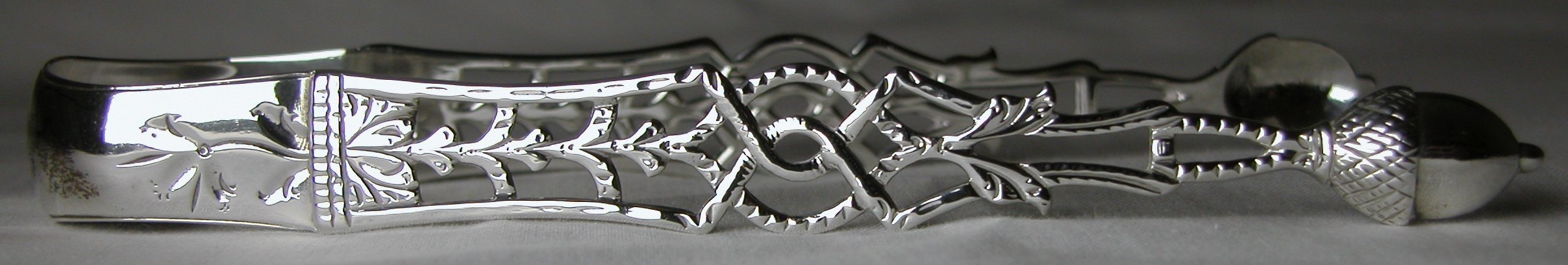 This pair of cast tongs are delightful. They have the usual Adam style engraved shoulder and lovely acorn styled bowls, with a very distinct nipple. They are in excellent condition, with no repairs and are a lovely example of cast tongs at their best. As with the other Thomas Wallis I cast tongs, they will be dated c1765 - 1775. Click on any picture to enlarge |