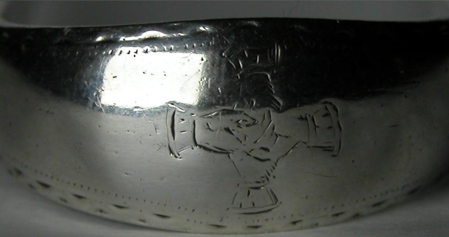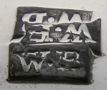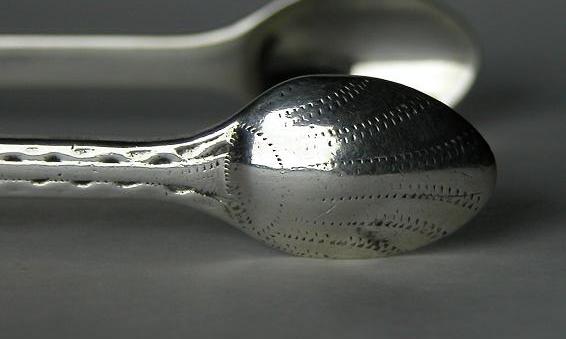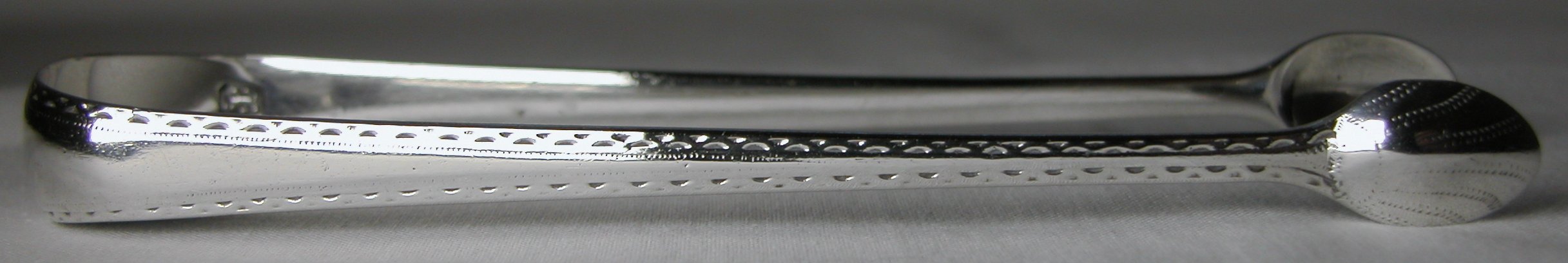 This pair of tongs is dated c1780 - 1784. The hallmark and maker's marks are in the bowls as appears to be the case with all of these William Burch tongs made prior to 1784. The maker's mark has been struck several times (at least 3). They are slightly smaller and more delicate than average, but their most interesting feature is the monogram. Were these made for the “Sealed Knot”? Click on any picture to enlarge |