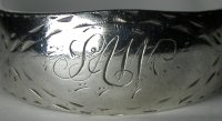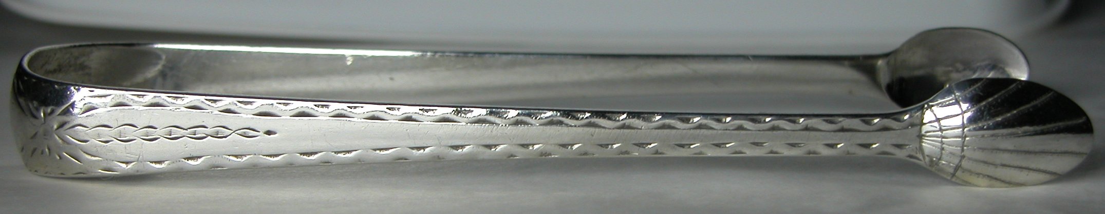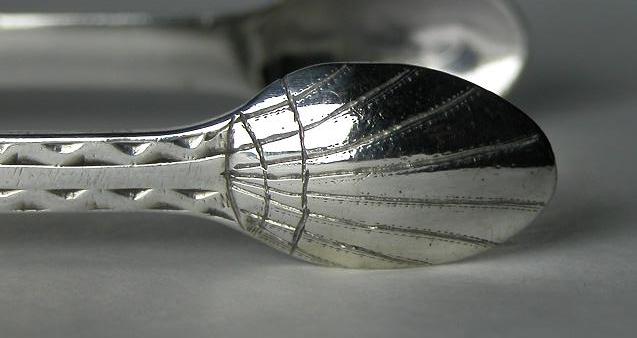 This pair of tongs is dated c1780 - 1784. The hallmark and maker's marks are in the bowls as appears to be the case with all of these William Burch tongs made prior to 1784. The bowls are a little unusual as they have the engraving cut into them with simple lines rather than a more normal bright cut engraved style. Click on any picture to enlarge |