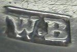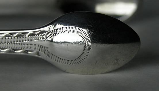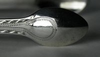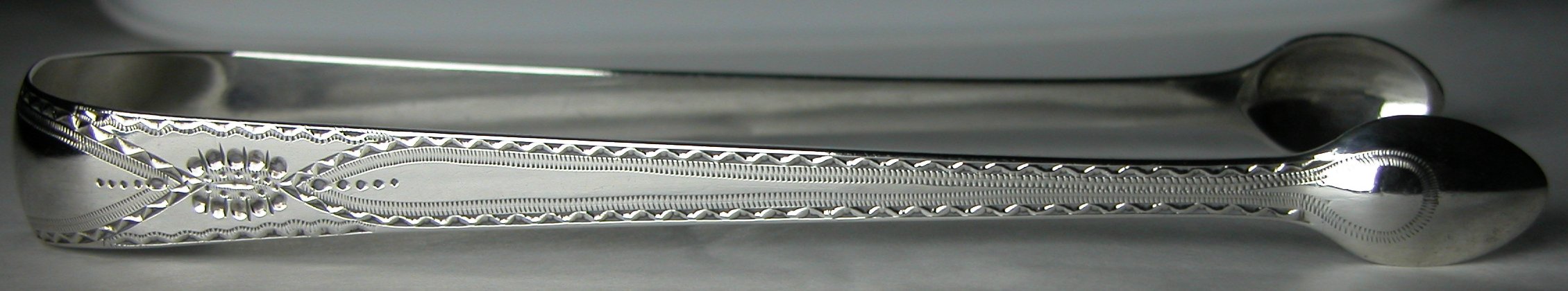 This pair of tongs is dated 1790/91. The hallmark and maker's marks are now under the bow. This seems to be a feature of this maker which is quite unusual. The style of the tongs is lovely with an eye-catching "bunch" towards the tops of the arms and a stylish loop in the bowls. Click on any picture to enlarge |