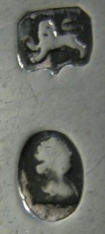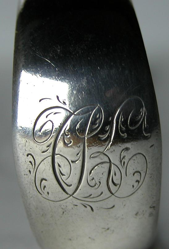 This pair of tongs is dated c1786 - 1790. The hallmark and maker's marks are now under the bow. This seems to be a feature of this maker which is quite unusual. The tongs are completely plain but have the monogram engraved sideways on the bow. This is sometimes seen but is not common. Click on any picture to enlarge |